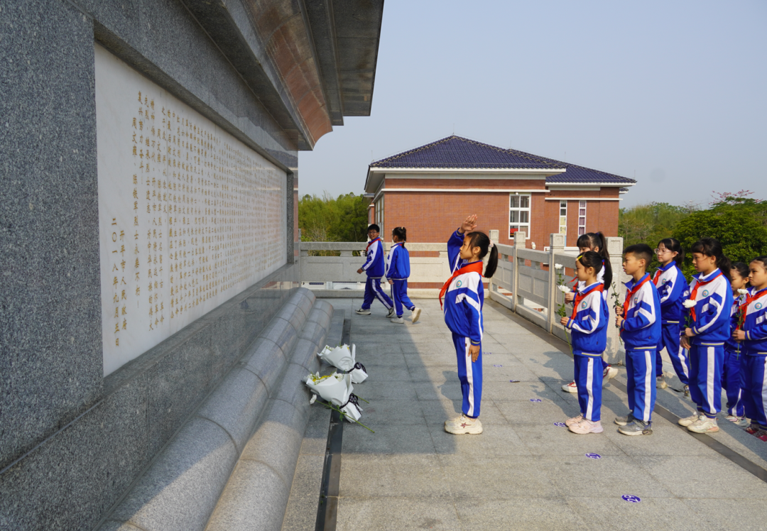 在烈士紀(jì)念碑前,全體人員整齊列隊(duì),懷著崇敬的心情瞻仰烈士紀(jì)念碑。隨后,全體肅立、默哀、鞠躬并敬獻(xiàn)鮮花,學(xué)生集體獻(xiàn)唱《中國(guó)少年先鋒隊(duì)隊(duì)歌》,鏗鏘有力的歌聲,表達(dá)出對(duì)革命先烈深深的敬仰與緬懷之情。