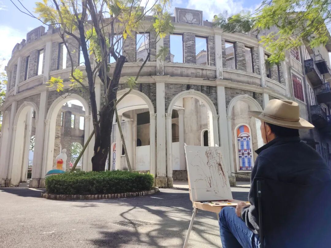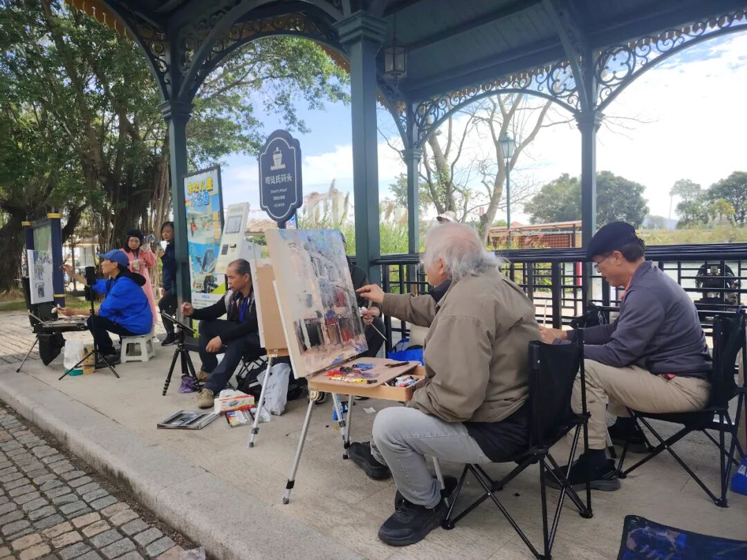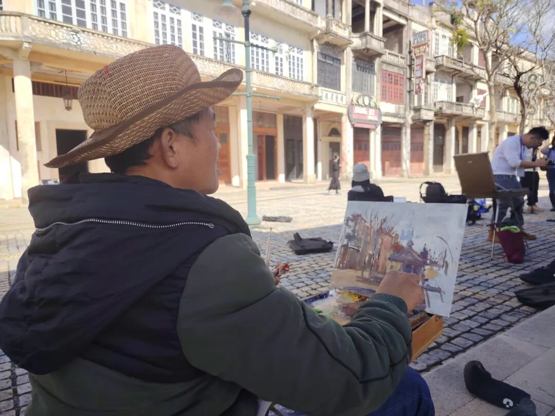 啟動儀式后,美術(shù)家們迅速進(jìn)入創(chuàng)作狀態(tài)。在赤坎華僑古鎮(zhèn),大家分散于街巷各處,尋找自己心儀的視角,有人面對連片騎樓鋪展畫布,以油彩勾勒建筑風(fēng)貌;也有畫家執(zhí)筆揮墨,以流暢線條捕捉市井煙火,力圖展現(xiàn)僑鄉(xiāng)建筑中西合璧的獨(dú)特神韻。