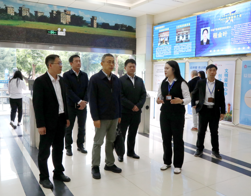 余中華一行首先來到開平市行政服務(wù)中心辦事大廳,實地了解窗口服務(wù)區(qū)、24小時自助服務(wù)區(qū)等功能場室以及大廳智慧政務(wù)設(shè)備使用、便民服務(wù)創(chuàng)新等情況,并召開座談會,聽取市政數(shù)局主要負責(zé)人工作情況匯報。