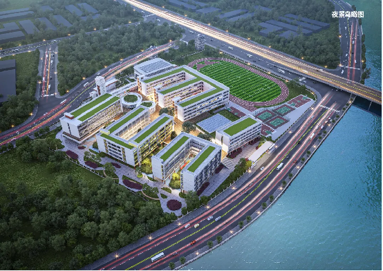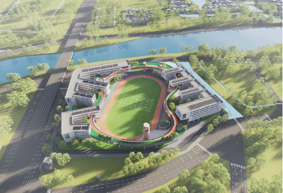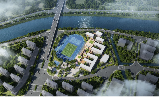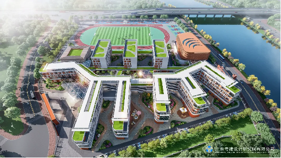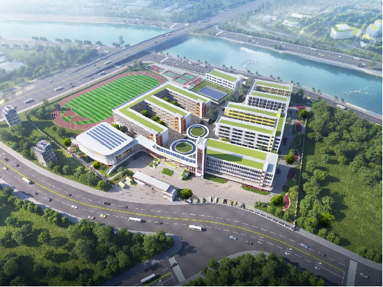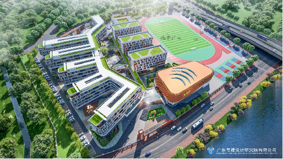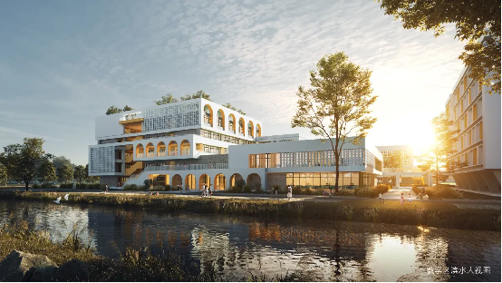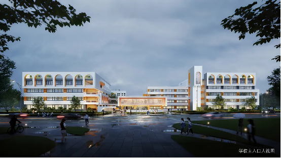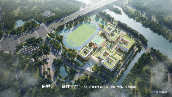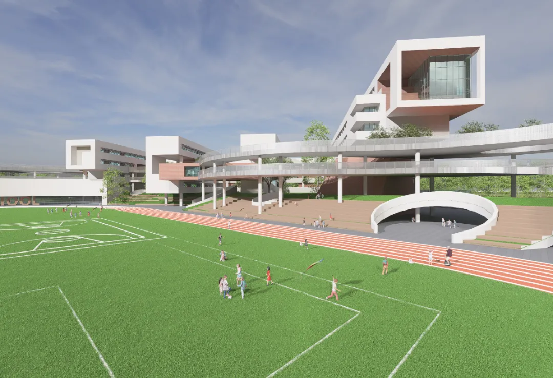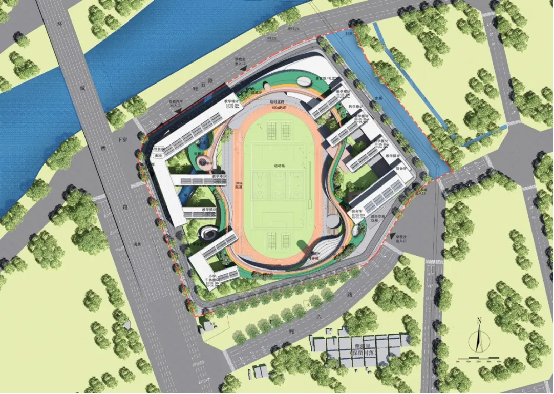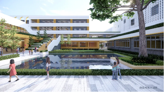 方案體現“科文綠環(huán)、樂學無界” 的設計理念,旨在打造一個融合教育、科技、文化與生態(tài)的創(chuàng)新校園空間,突破傳統(tǒng)校園單一課室功能空間的界限,營造適合不同年齡段學生,充分激發(fā)創(chuàng)新與藝術靈感的多元學習環(huán)境。通過建立綠化通廊,將小學和初中兩個建筑群有機地連接起來,形成一個整體。環(huán)繞的綠廊既是科創(chuàng)藝術主題的共享式活動長廊,也是連接多功能課余活動空間的交通敞廊,為師生提供了一個共同學習和交流互動的平臺。綠化連廊的架空設計,塑造豐富的視線景觀通廊,使校園內外部環(huán)境緊密相連,與自然環(huán)境形成對話,使蒼江水、田野與城市相互滲透,從而創(chuàng)造出融入自然又富有活力的建筑空間,真正實現快樂學習、快樂生活。