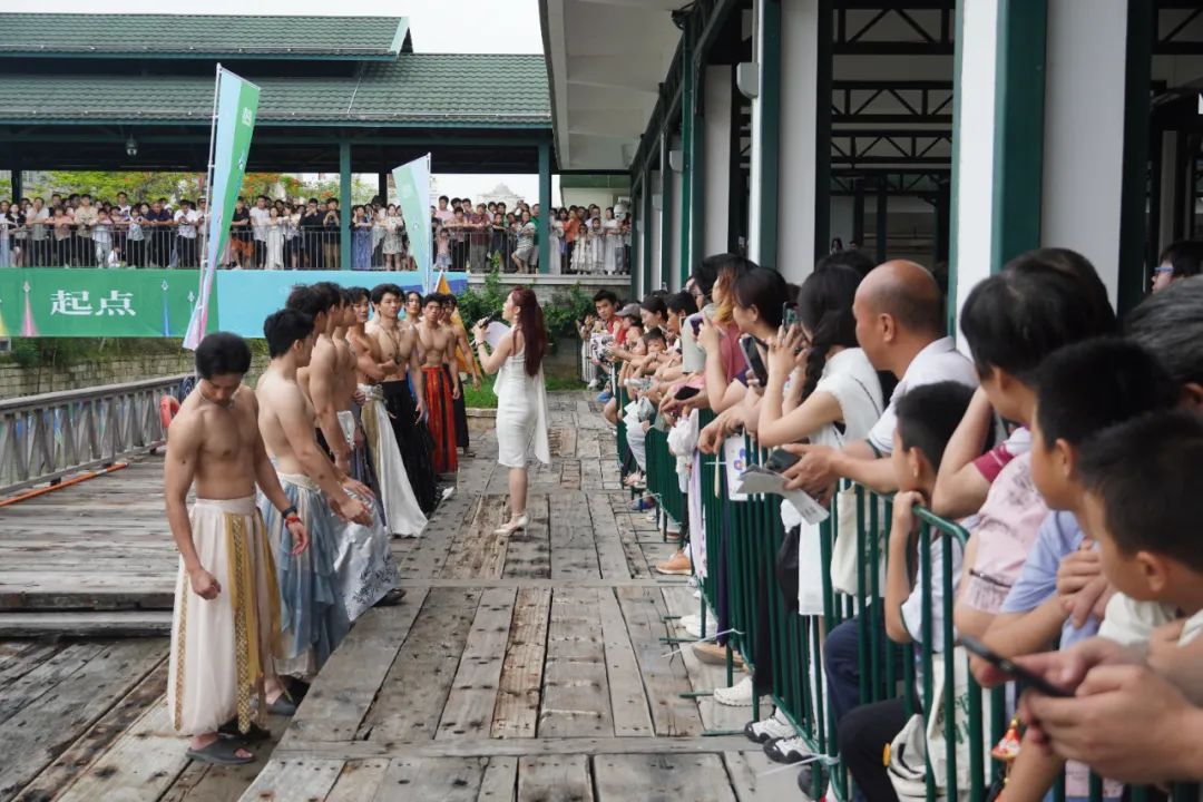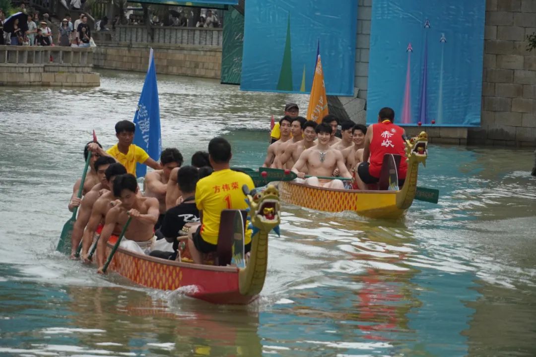 古鎮(zhèn)內(nèi),水上百舸爭流,岸上游人如織,一場酣暢淋漓的“腹肌破浪賽”正展現(xiàn)在市民游客面前。身穿新中式服飾的猛男劃手赤膊上陣,奮力劃槳,肌肉線條和飛濺浪花交織成力與美的畫卷,引得眾多游客頻頻按下快門。