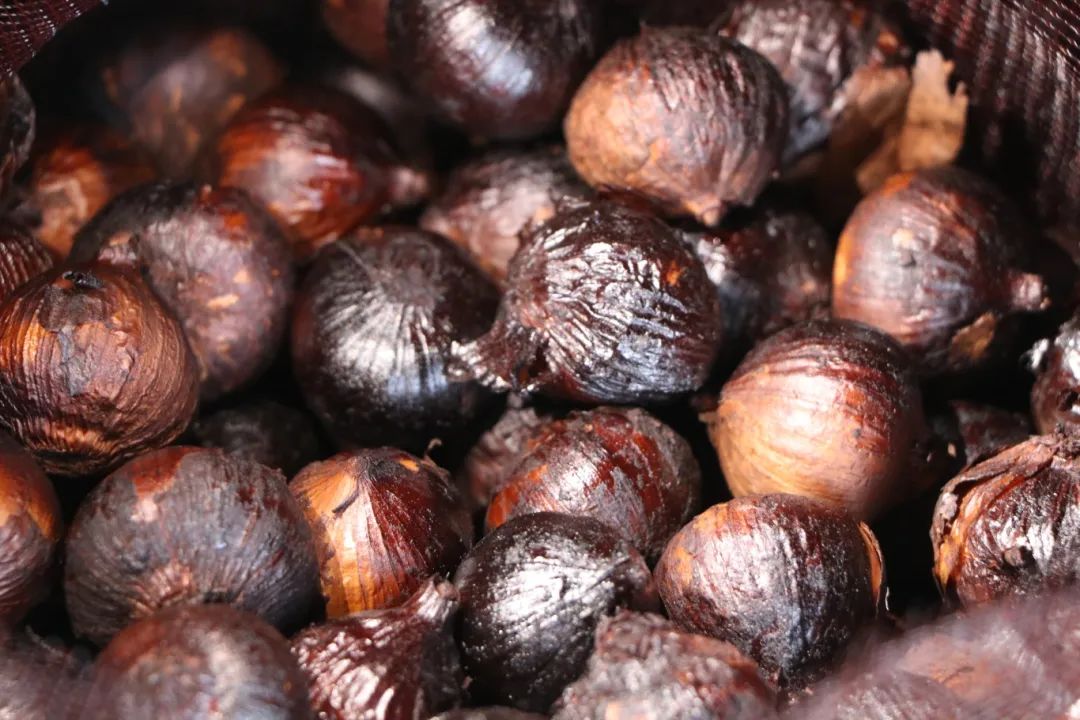 這種匠心獨具的煙熏工藝,造就了金山火蒜“蒜衣深褐如炭、肉質(zhì)甘甜膠潤,辛辣中裹挾著草木焦香”的獨特風味。未經(jīng)熏烘的蒜頭易發(fā)芽、招蟲,而經(jīng)過熏制的火蒜保存時間大大延長。正是這種特性,讓它在19世紀末成為下南洋、闖金山的開平華僑行囊中不可或缺的“護身符”。