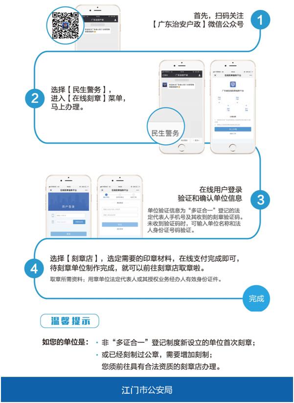 2018年,廣東省公安廳在全省推廣使用廣東省公章治安管理信息系統(tǒng),創(chuàng)新推出了手機(jī)端在線刻章便民服務(wù)。江門市全面推進(jìn)“互聯(lián)網(wǎng)+公章”服務(wù)與監(jiān)管新模式,并于2018年10月1日正式上線廣東省公章治安管理信息系統(tǒng)。10月20日全市范圍內(nèi)全面取消非芯片公章備案,新制作及因磨損、丟失等需要重新更換的公章須統(tǒng)一嵌入安全芯片。