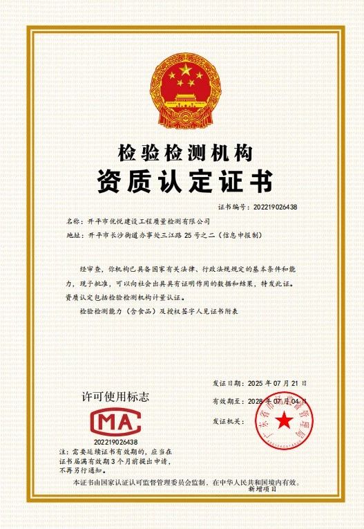 市公控集團屬下企業(yè)開平市優(yōu)悅建設(shè)工程質(zhì)量檢測有限公司(簡稱“優(yōu)悅檢測公司”)喜添新專項資質(zhì)!今年7月5至6日,經(jīng)廣東省市場監(jiān)督管理局資質(zhì)評審組全面、嚴(yán)格的現(xiàn)場評審,公司申報的8個類別新增項目順利通過95個新增參數(shù)考核,成功斬獲CMA道路工程檢測專項資質(zhì)。此前,公司已持有地基基礎(chǔ)、主體結(jié)構(gòu)及裝飾裝修、建筑材料及構(gòu)配件三個專項共21個項目檢測資質(zhì),此次升級后檢測參數(shù)從263個增至358個。