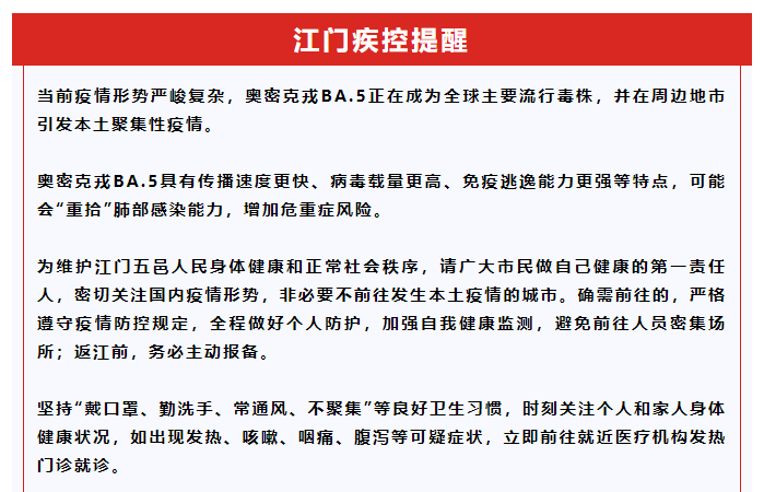 為保障我市人民群眾身體健康和生命安全,江門疾控再次發(fā)出重要提醒: