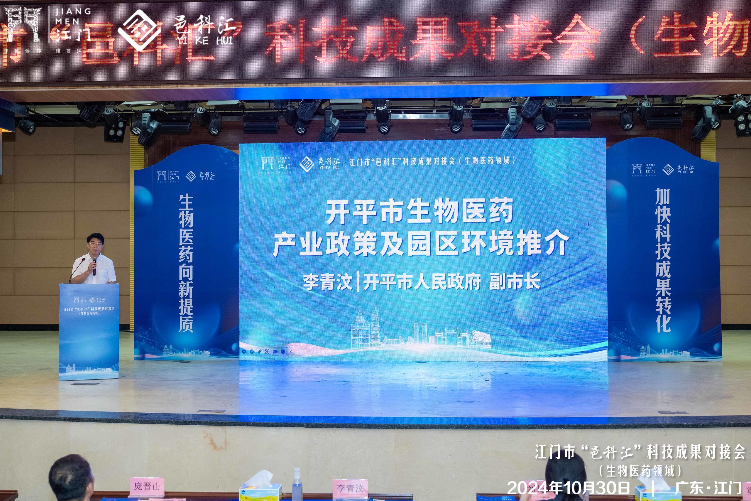 為推進(jìn)科技成果轉(zhuǎn)移轉(zhuǎn)化進(jìn)程,加快形成開(kāi)平生物醫(yī)藥產(chǎn)業(yè)的新質(zhì)生產(chǎn)力,近日,江門(mén)市科技局、江門(mén)市投資促進(jìn)局、開(kāi)平市科工商務(wù)局、省科學(xué)院江門(mén)產(chǎn)業(yè)技術(shù)研究院、江門(mén)市科技服務(wù)中心在開(kāi)平翠山湖管委會(huì)聯(lián)合舉辦了江門(mén)市“邑科匯”科技成果對(duì)接會(huì)(生物醫(yī)藥領(lǐng)域)。