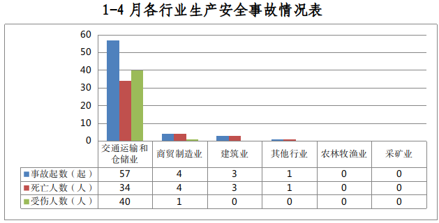 全市共發(fā)生生產(chǎn)安全事故65起,其中交通運(yùn)輸和倉儲(chǔ)業(yè)57起、占88%,商貿(mào)制造業(yè)4起、占6%,建筑業(yè)3起、占5%,其他行業(yè)1起、占1%。農(nóng)林牧漁業(yè)和采礦業(yè)未發(fā)生生產(chǎn)安全事故。