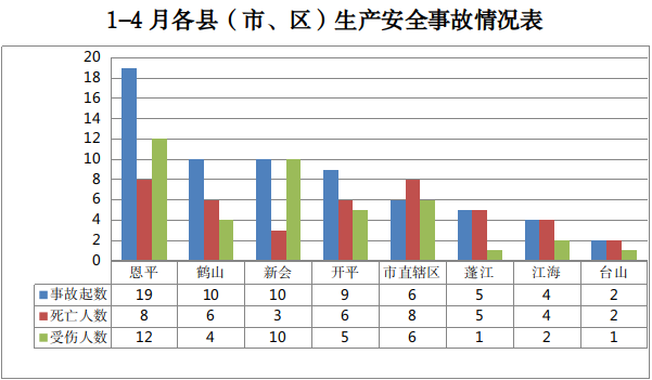 全市發(fā)生生產(chǎn)安全事故65起:恩平市19起,鶴山市10起,新會(huì)區(qū)10起,開平市9起,市直轄區(qū)16起,蓬江區(qū)5起,江海區(qū)4起,臺(tái)山市2起。