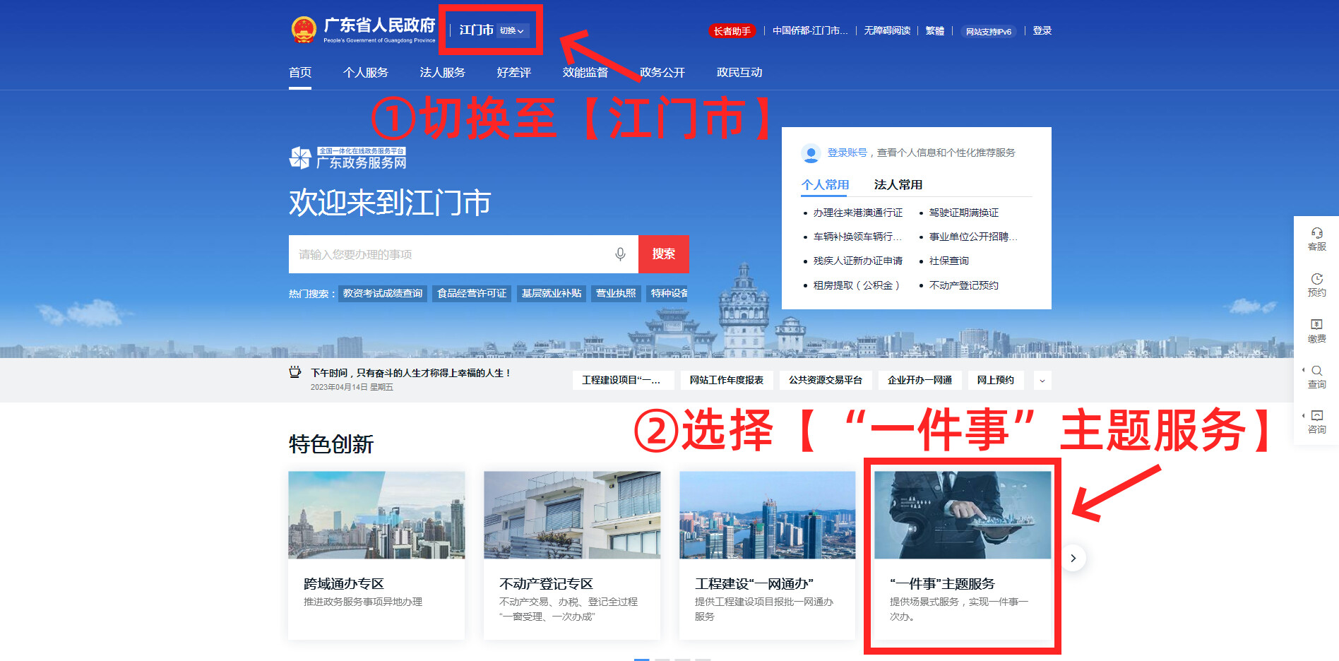 第二步:城市切換為【江門市】→選擇【“一件事”主題服務(wù)】(更換圖片)