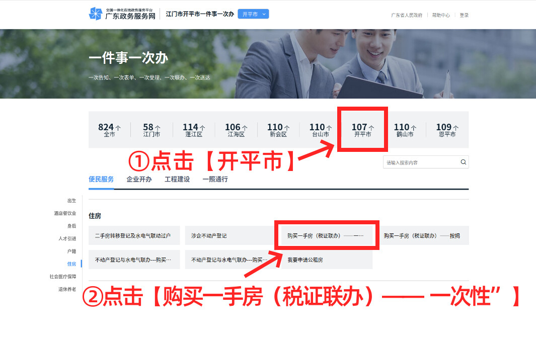 第三步:先選擇【開平市】,再從“便民服務(wù)”中找到【購買一手房(稅證聯(lián)辦)——一次性”】,點擊進入(更換圖片)