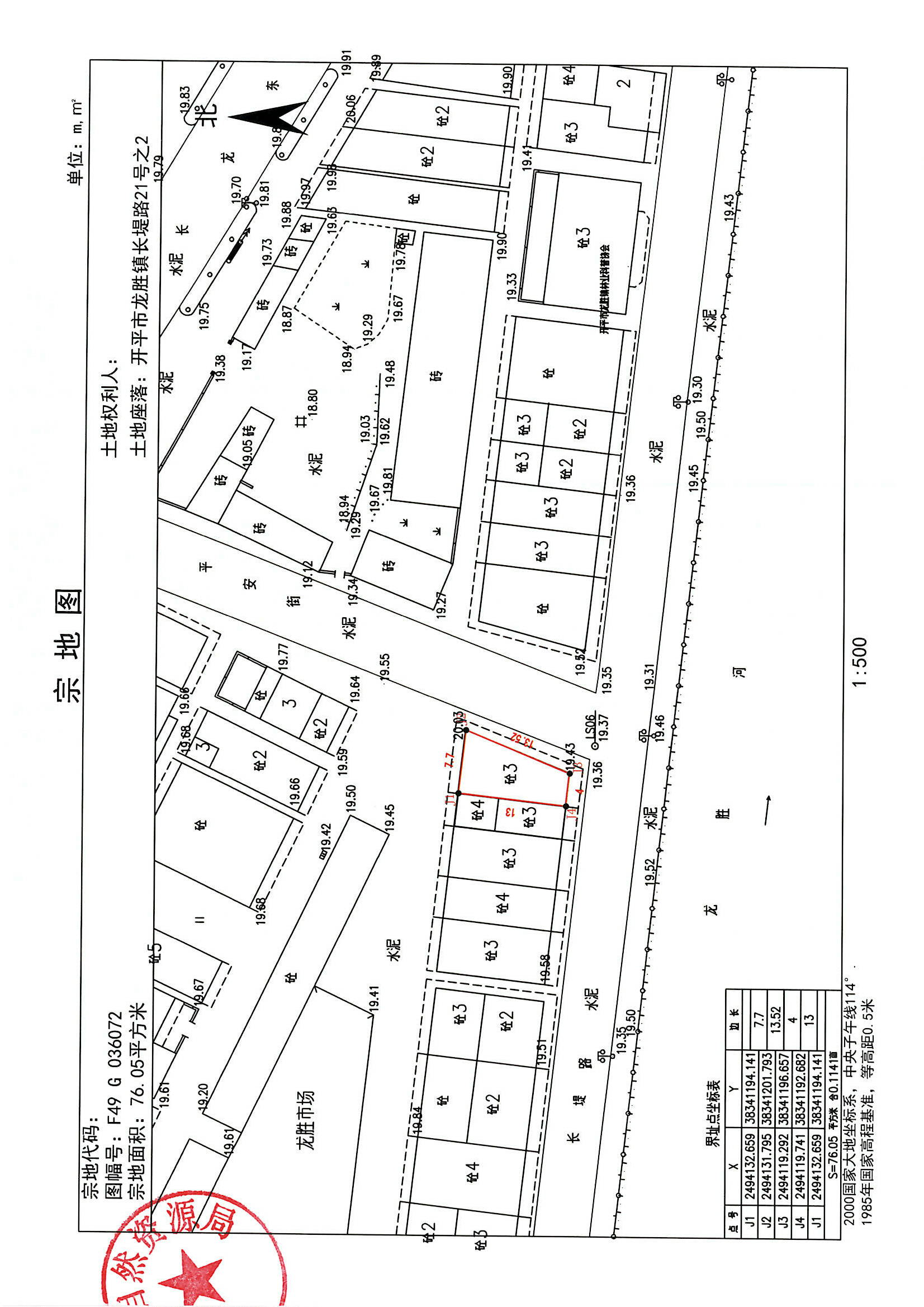坐落在開平市龍勝圩長(zhǎng)堤路21號(hào)-2(現(xiàn)編門牌:開平市龍勝鎮(zhèn)長(zhǎng)堤路21號(hào)之2)[開府國(guó)用(1998)第01047號(hào)]的土地使用權(quán),原土地面積77.5平方米,現(xiàn)重新測(cè)繪后土地面積76.05平方米。用地單位馮錫權(quán)現(xiàn)申請(qǐng)辦理不動(dòng)產(chǎn)變更登記。若對(duì)該用地界線范圍內(nèi)的用地或地上建筑物權(quán)屬有異議者,自公告之日起15個(gè)工作日內(nèi)向開平市自然資源局龍勝自然資源所書面提出意見。如無(wú)異議,公告期滿即給該單位辦理不動(dòng)產(chǎn)登記有關(guān)手續(xù)。用地界線詳見附圖。