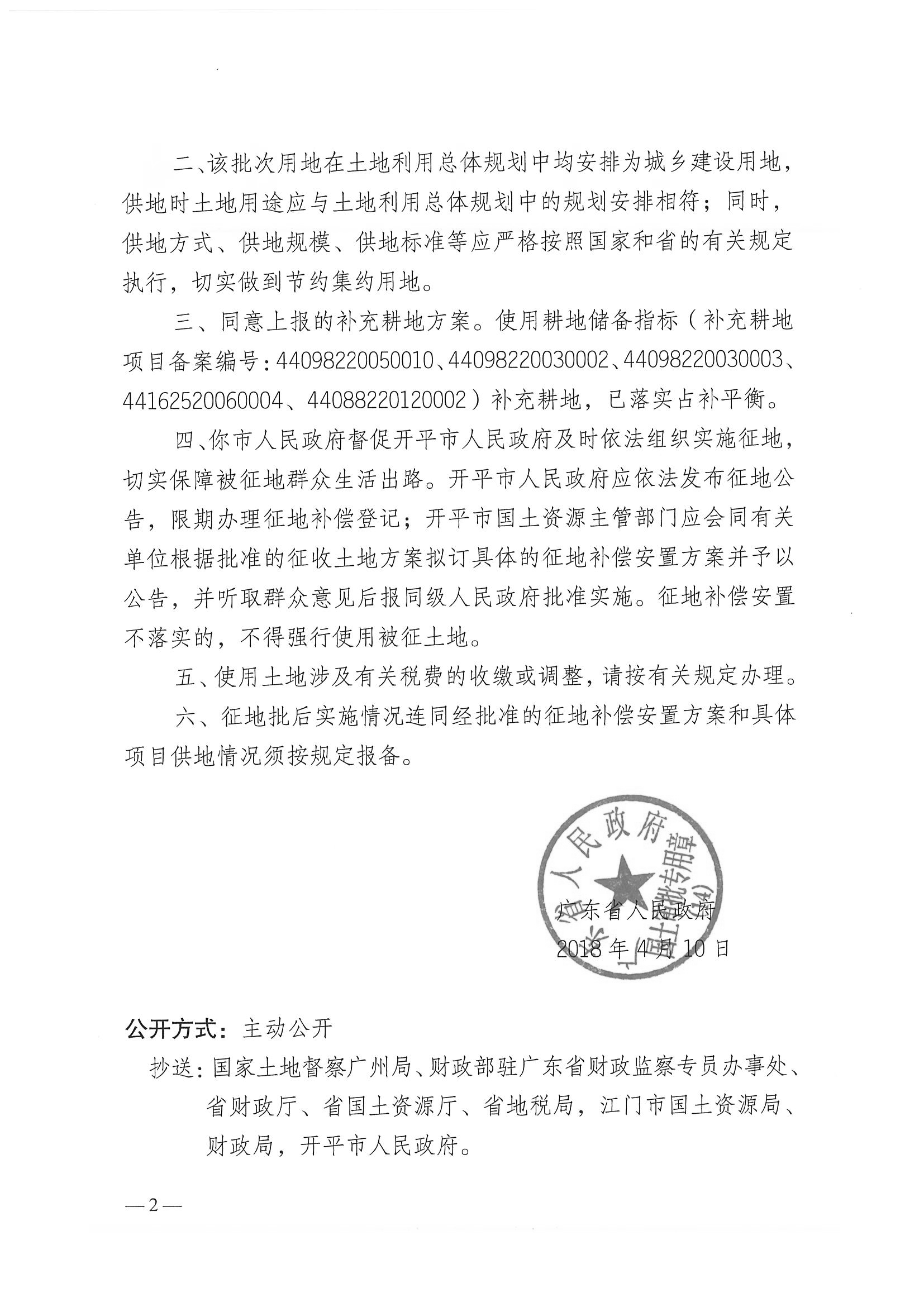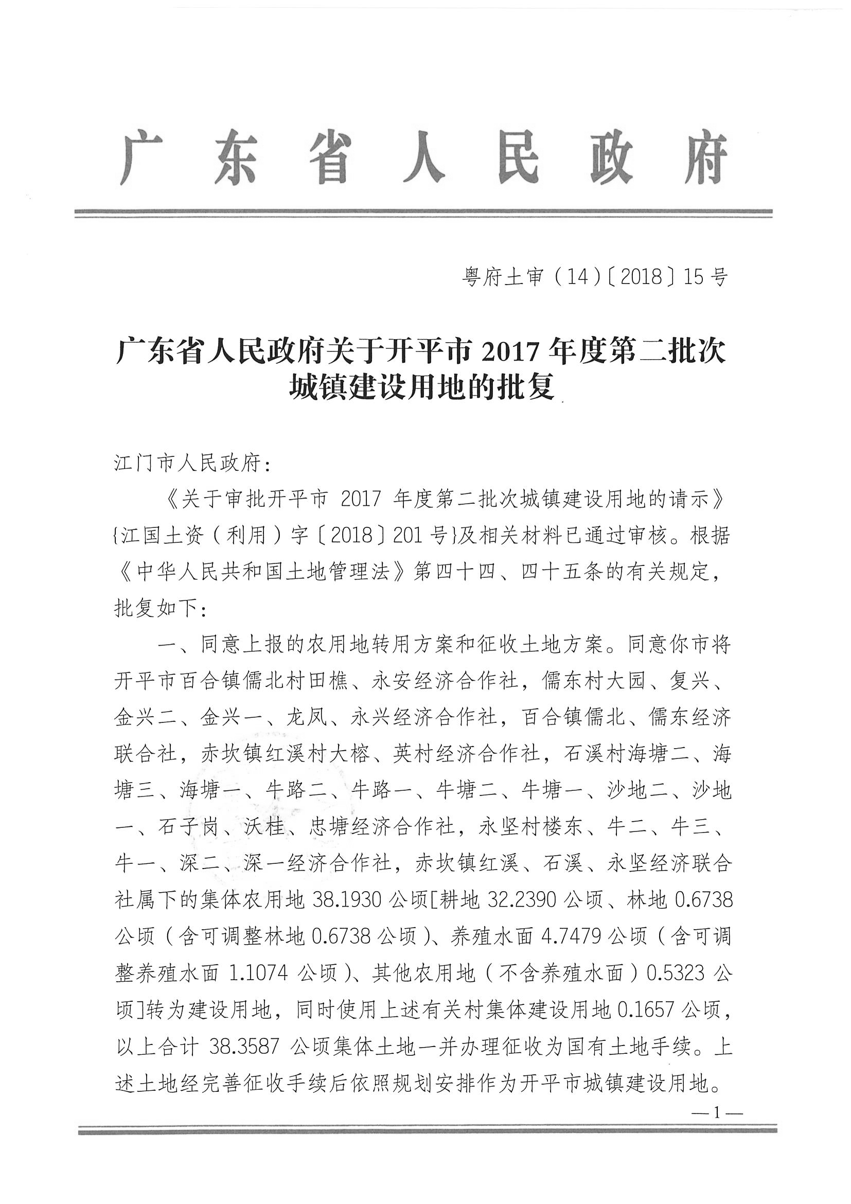 廣東省人民政府關(guān)于開平市2017年度第二批次城鎮(zhèn)建設(shè)用地的批復