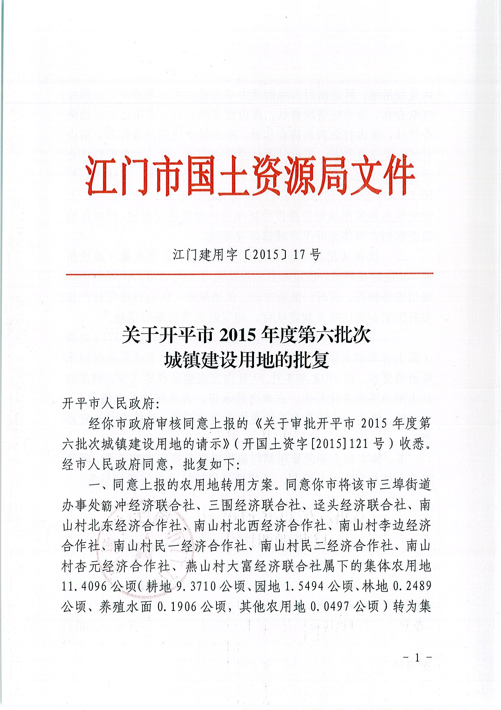 開平市2015年度第六批次城鎮(zhèn)建設(shè)用地的批復(fù)