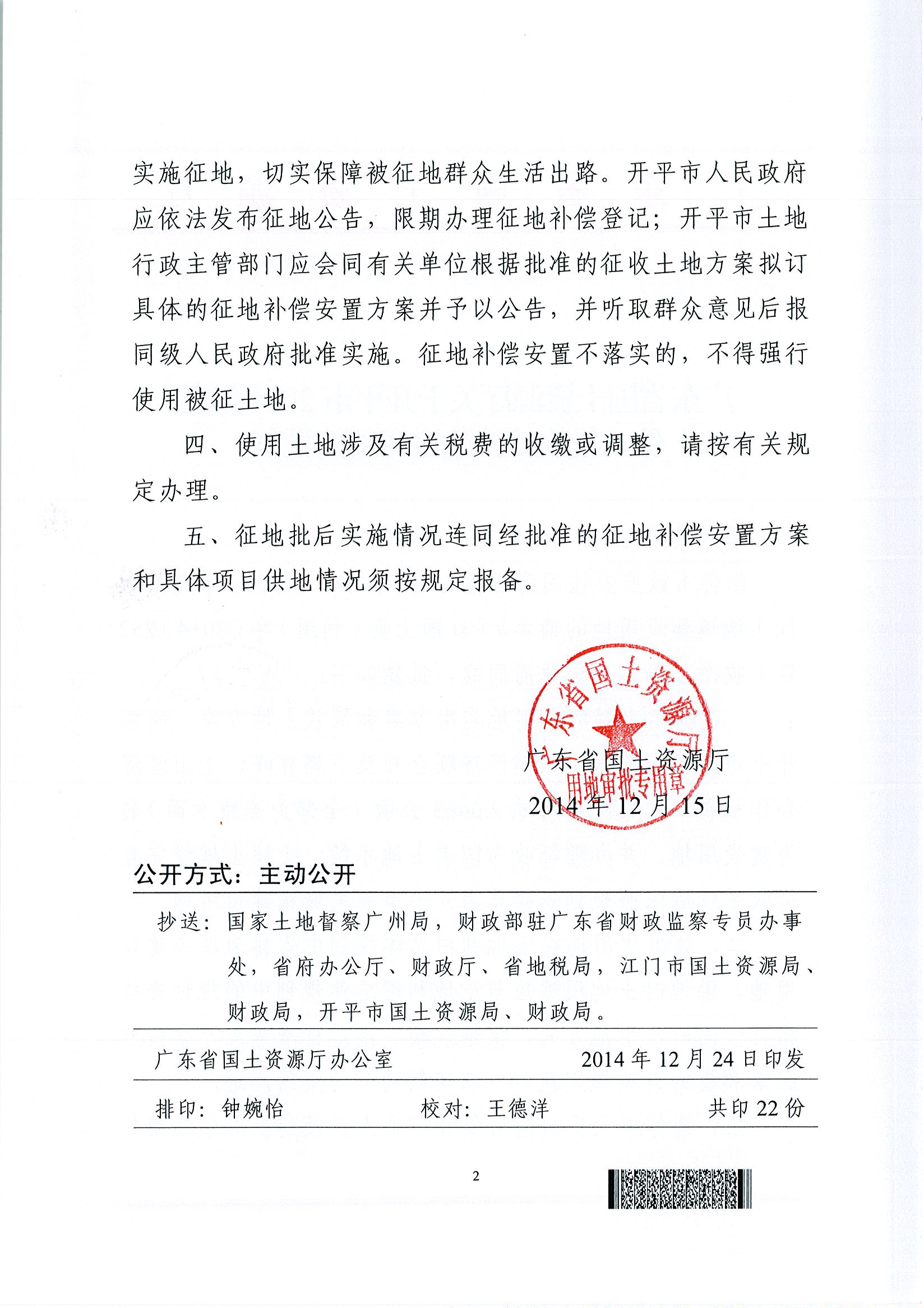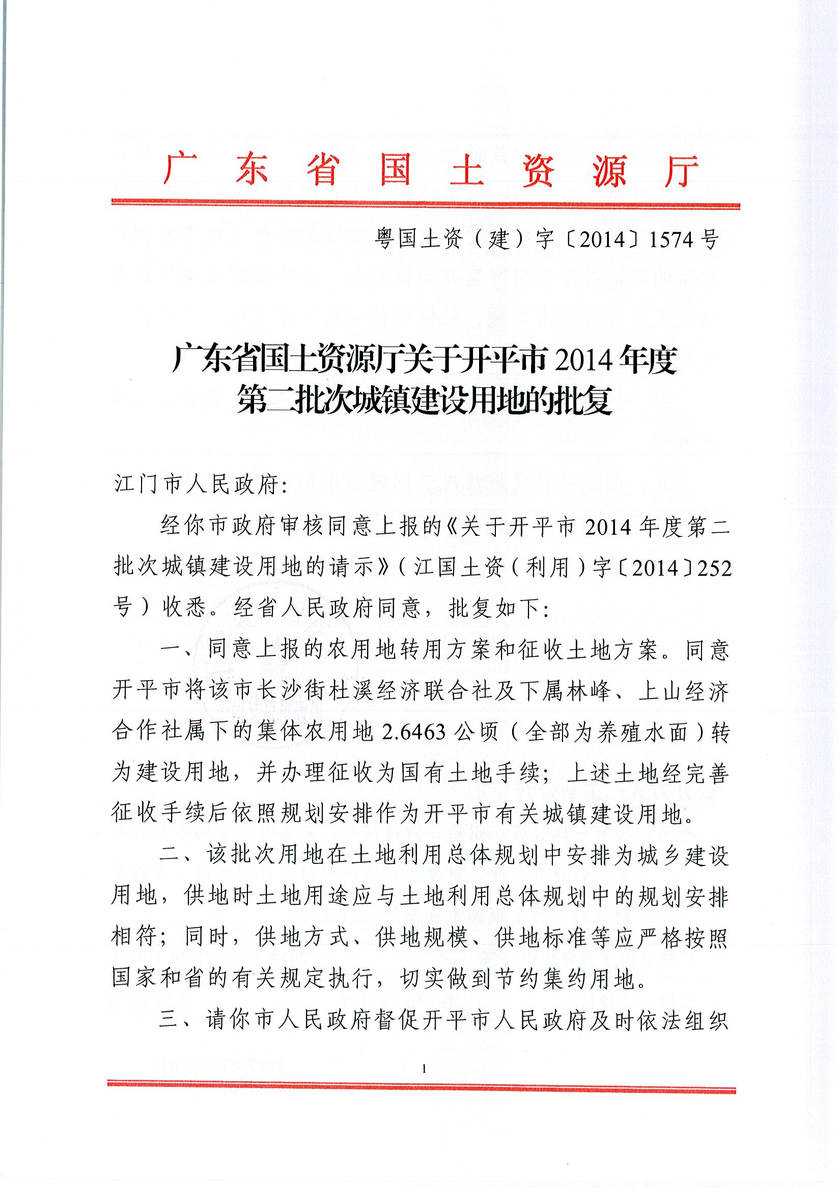 開(kāi)平市2014年度第二批次城鎮(zhèn)建設(shè)用地的批復(fù)