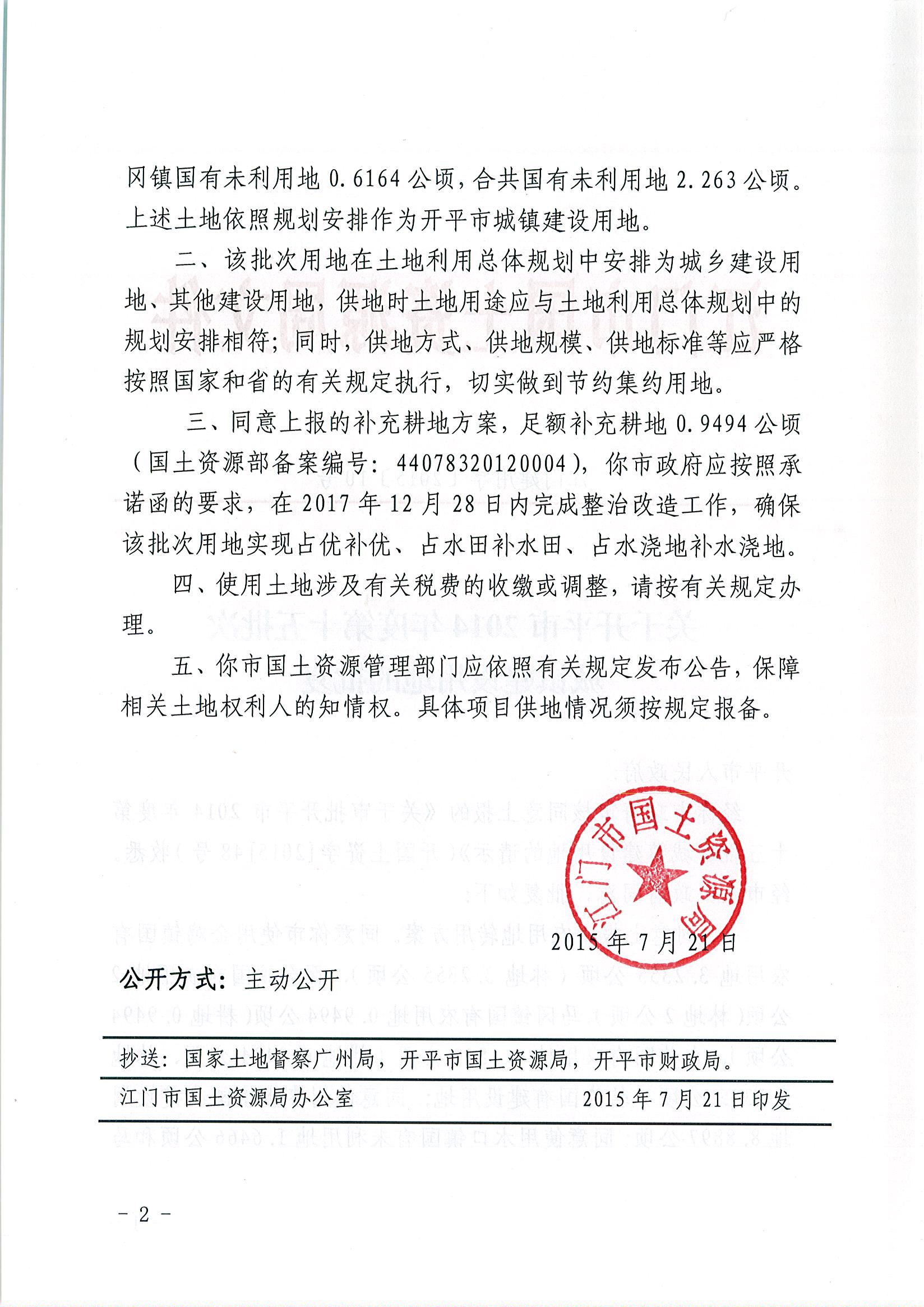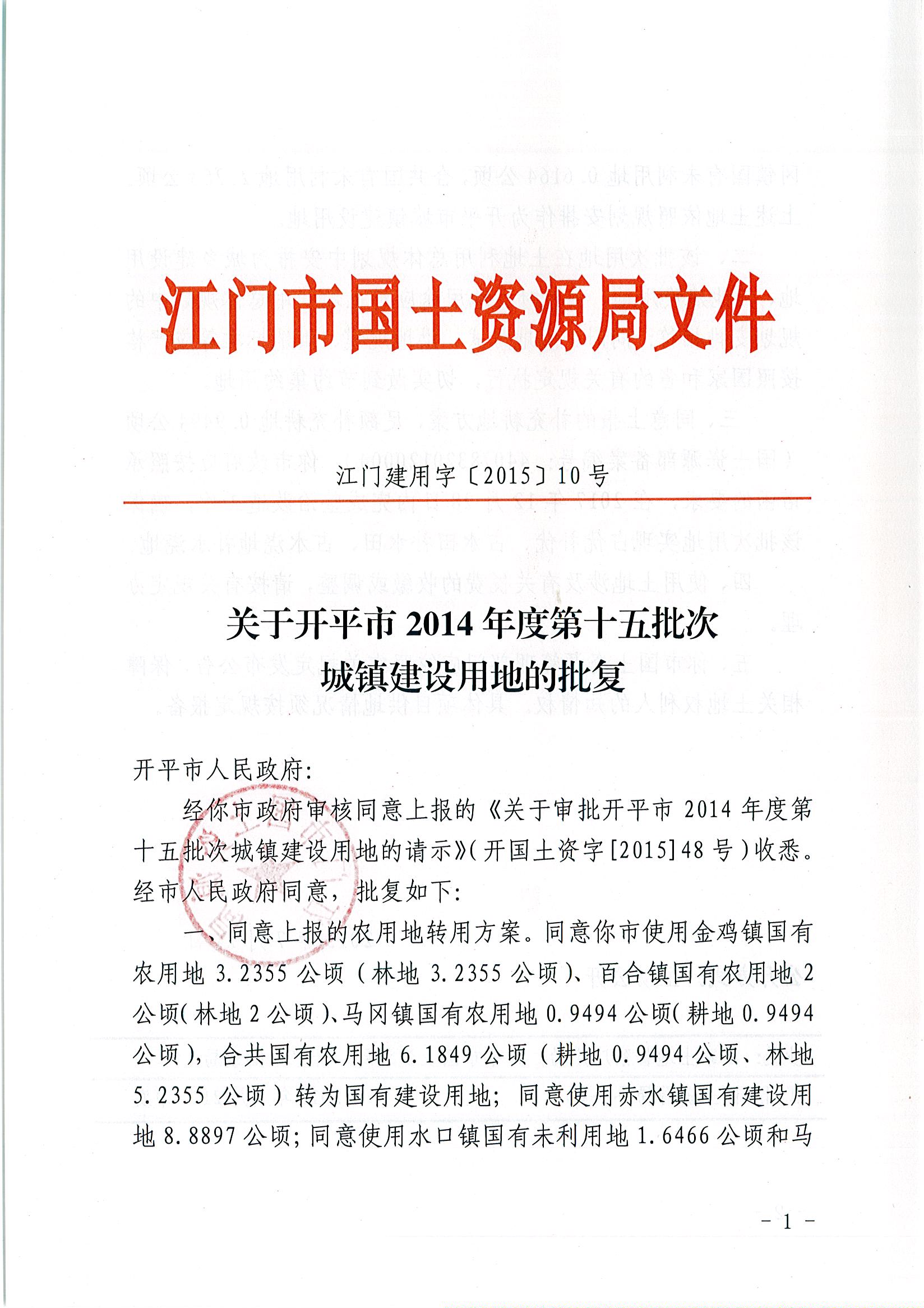 開平市2014年度第十五批次城鎮(zhèn)建設用地的批復