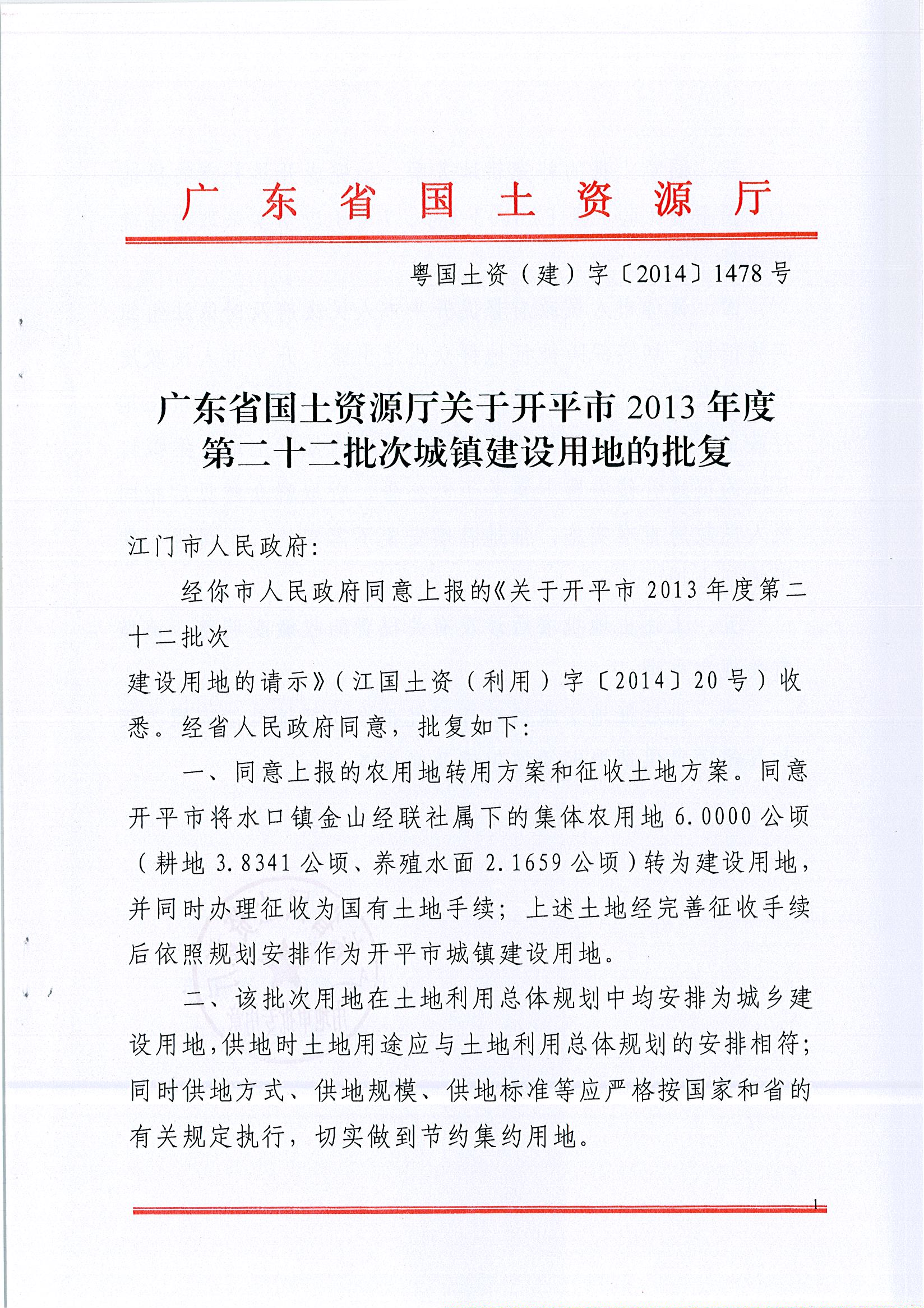 開平市2013年度第二十二批次城鎮(zhèn)建設(shè)用地的批復(fù)