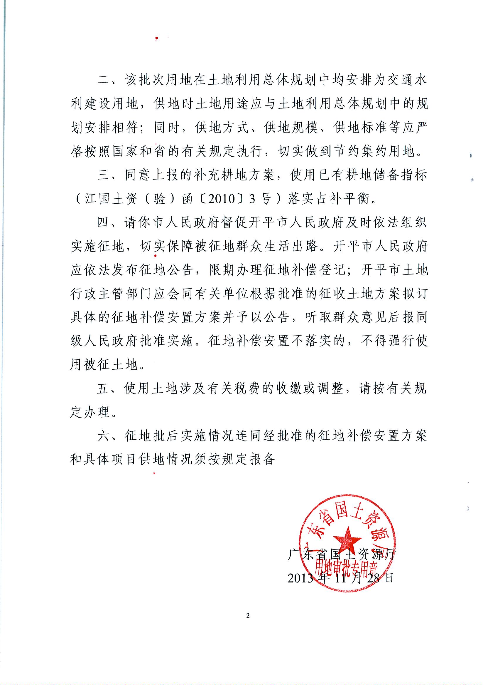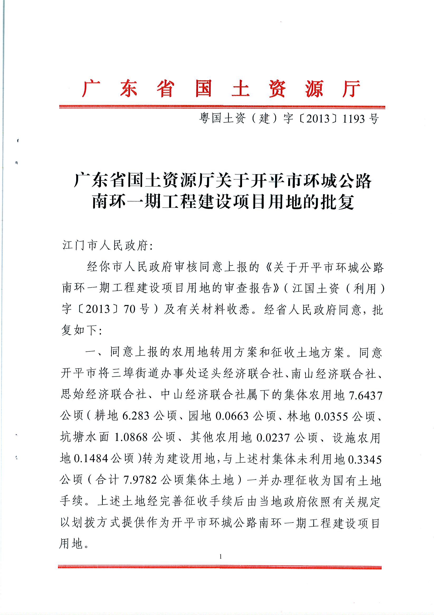 開平市環(huán)城公路南環(huán)一期工程建設(shè)項(xiàng)目用地的批復(fù)