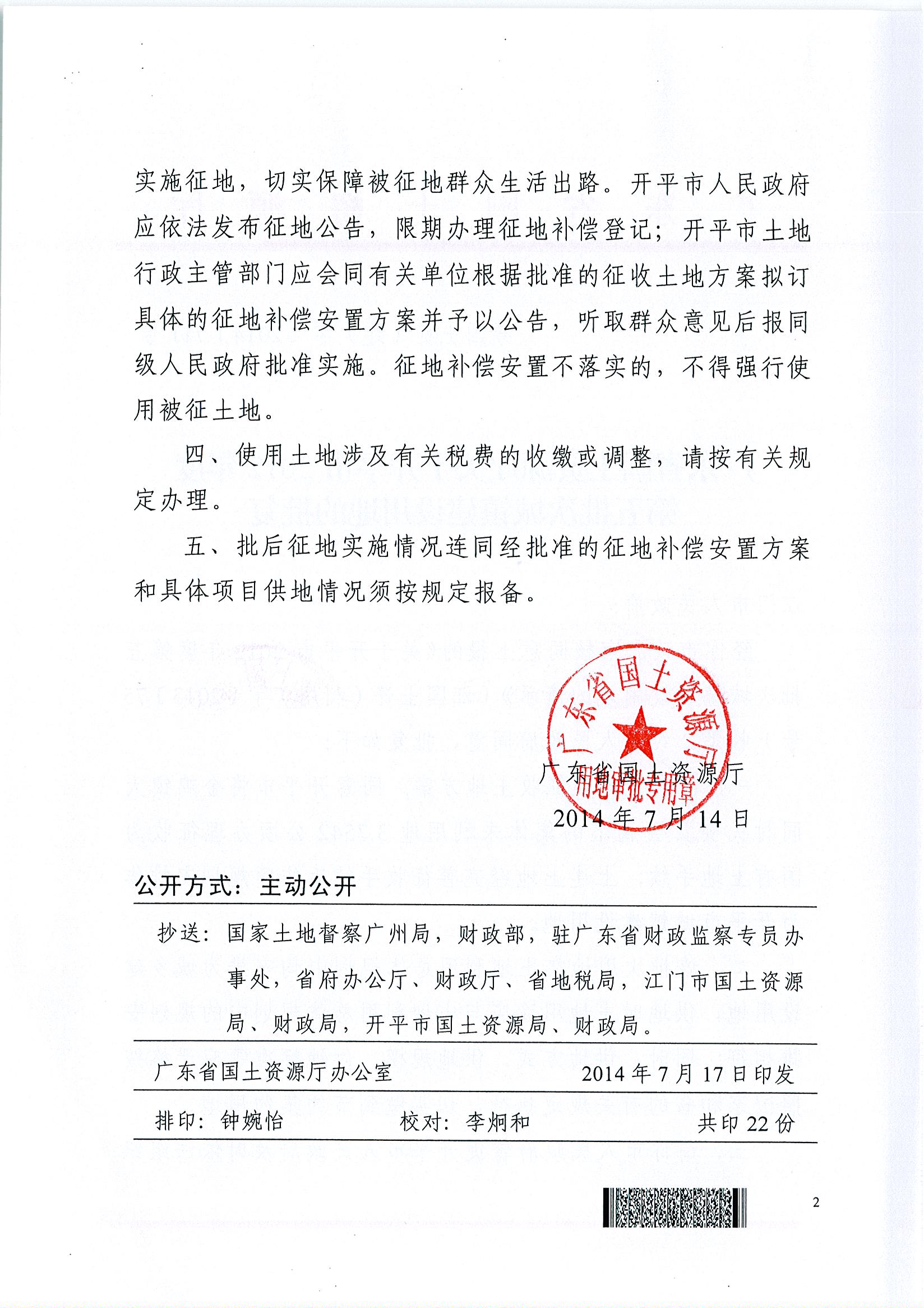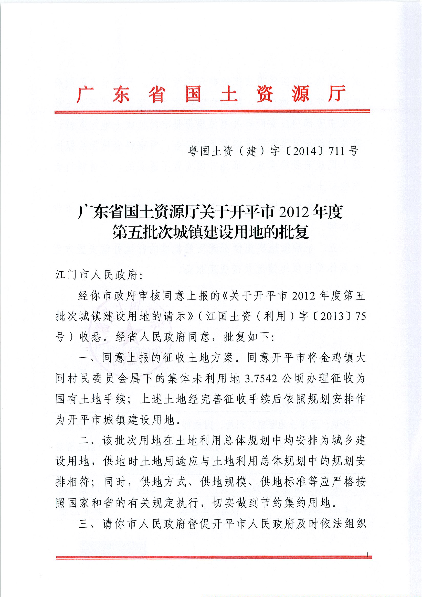 開平市2012年度第五批次城鎮(zhèn)建設(shè)用地的批復(fù)