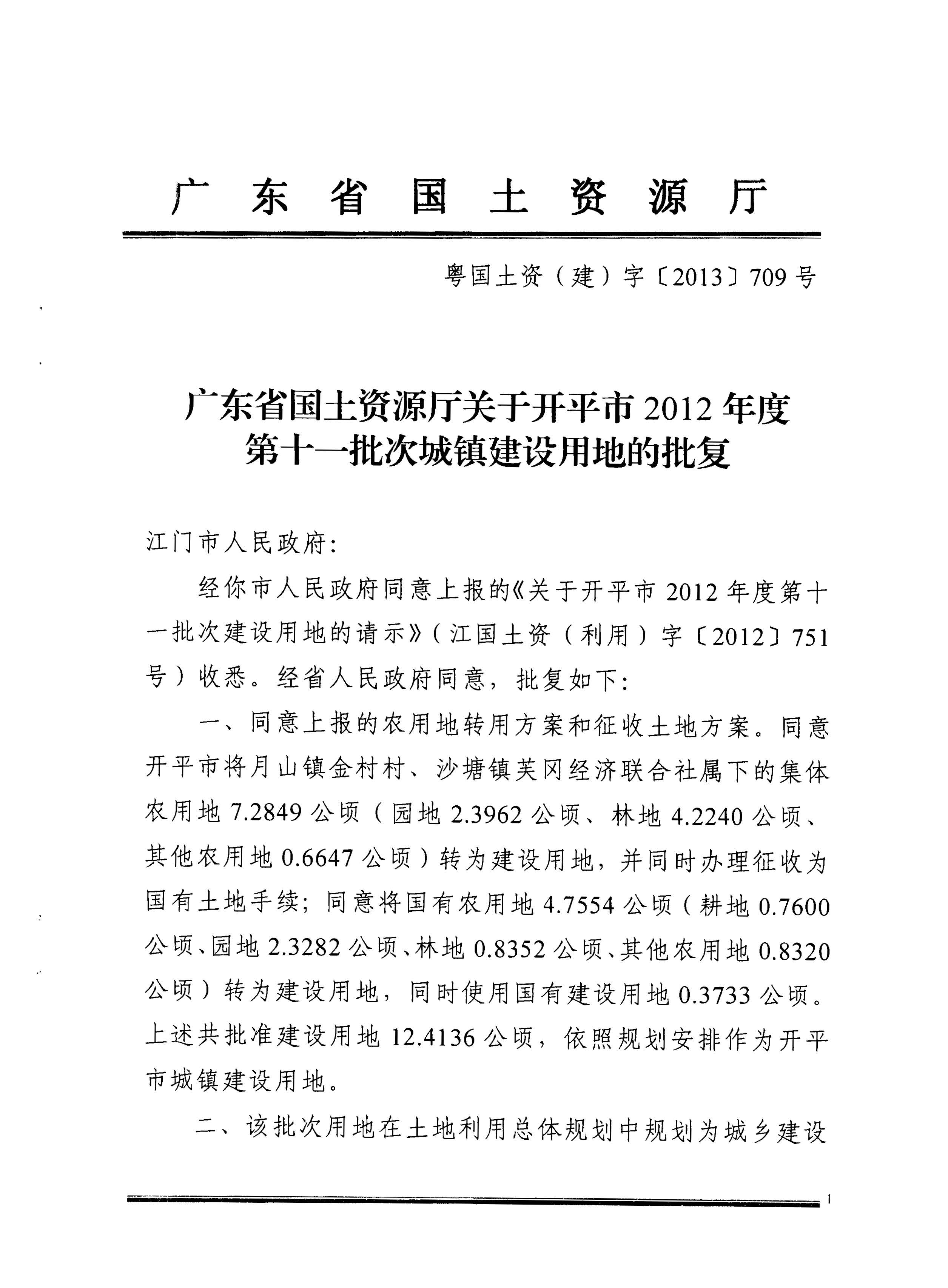 開平市2012年度第十一批次城鎮(zhèn)建設用地的批復