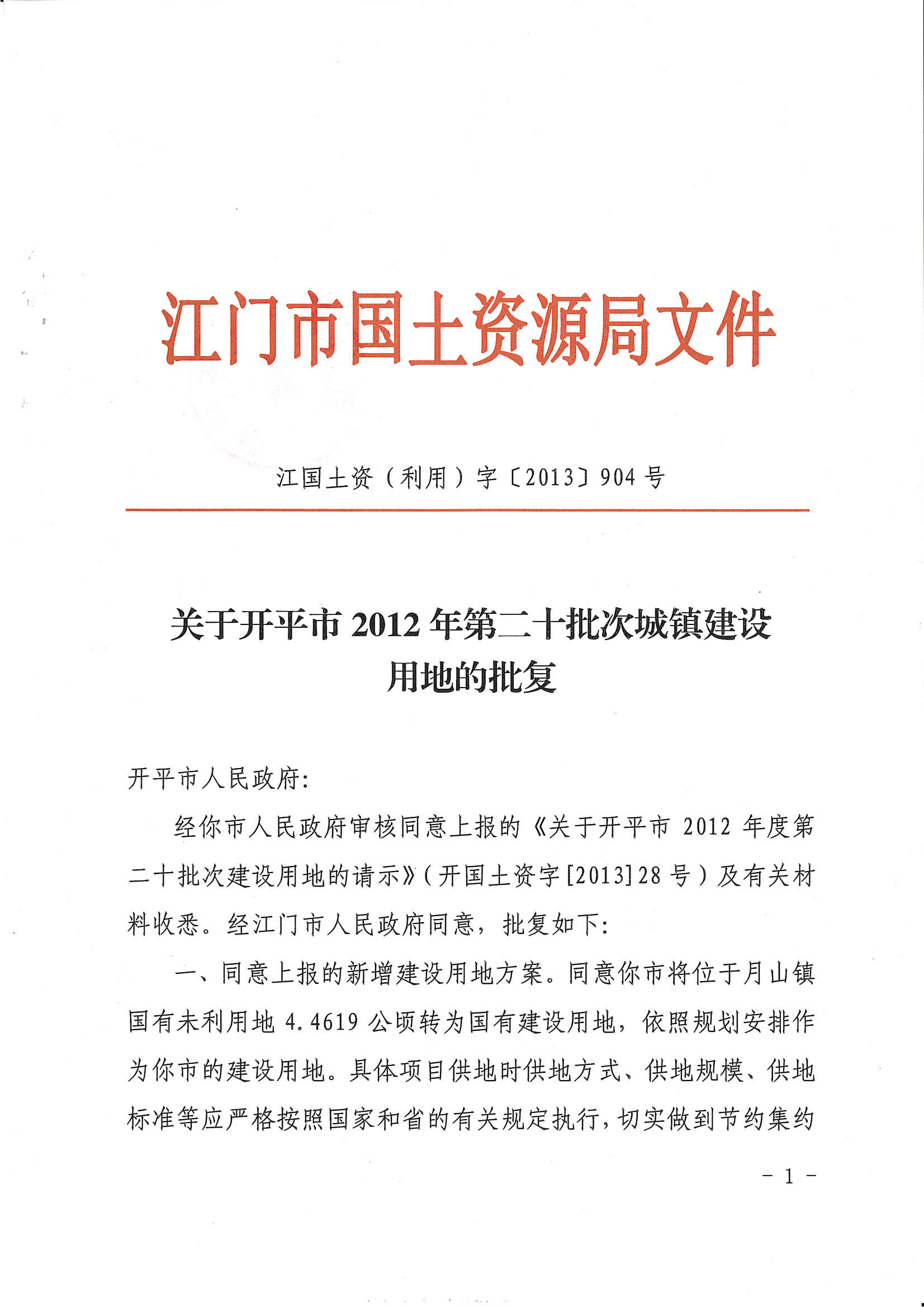 開(kāi)平市2012年度第二十批次城鎮(zhèn)建設(shè)用地的批復(fù)