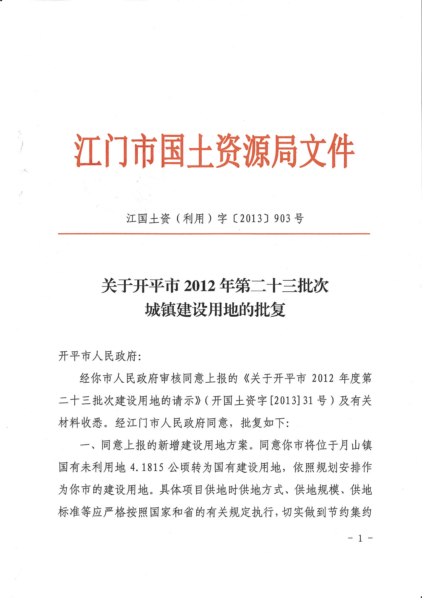 開平市2012年度第二十三批次城鎮(zhèn)建設(shè)用地的批復(fù)