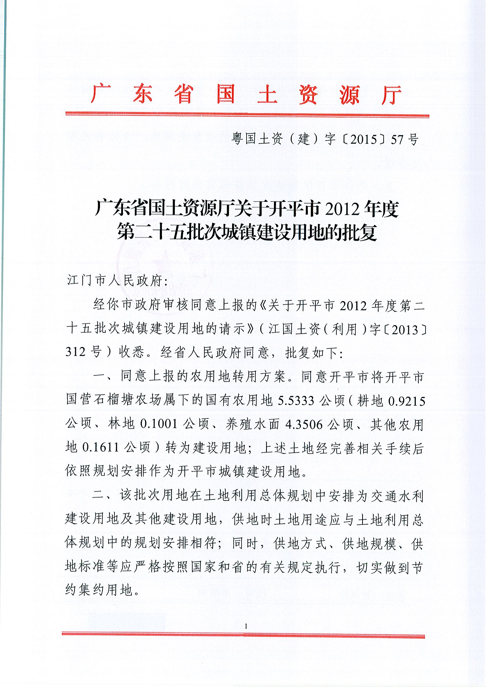 開平市2012年度第二十五批次城鎮(zhèn)建設(shè)用地的批復(fù)