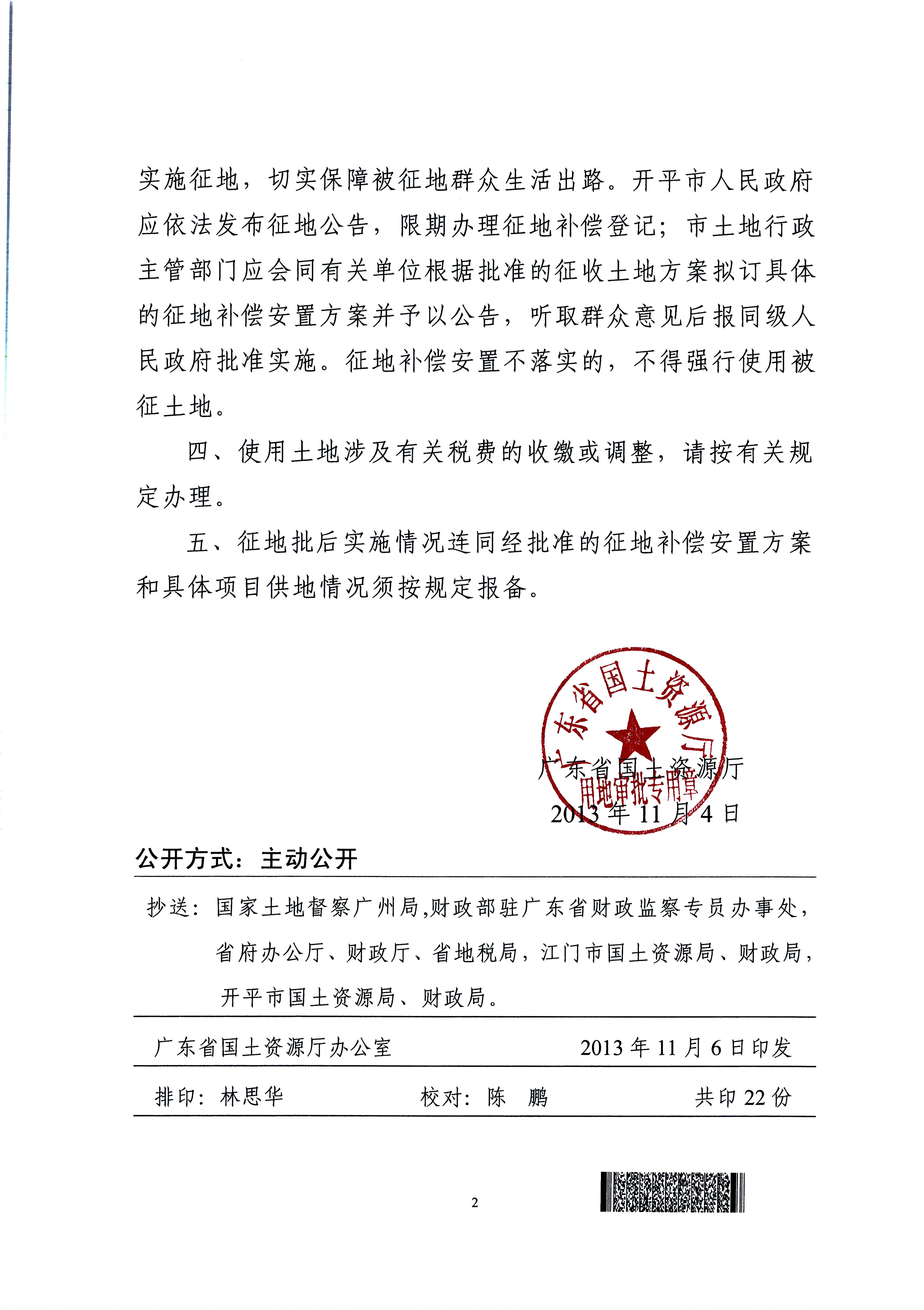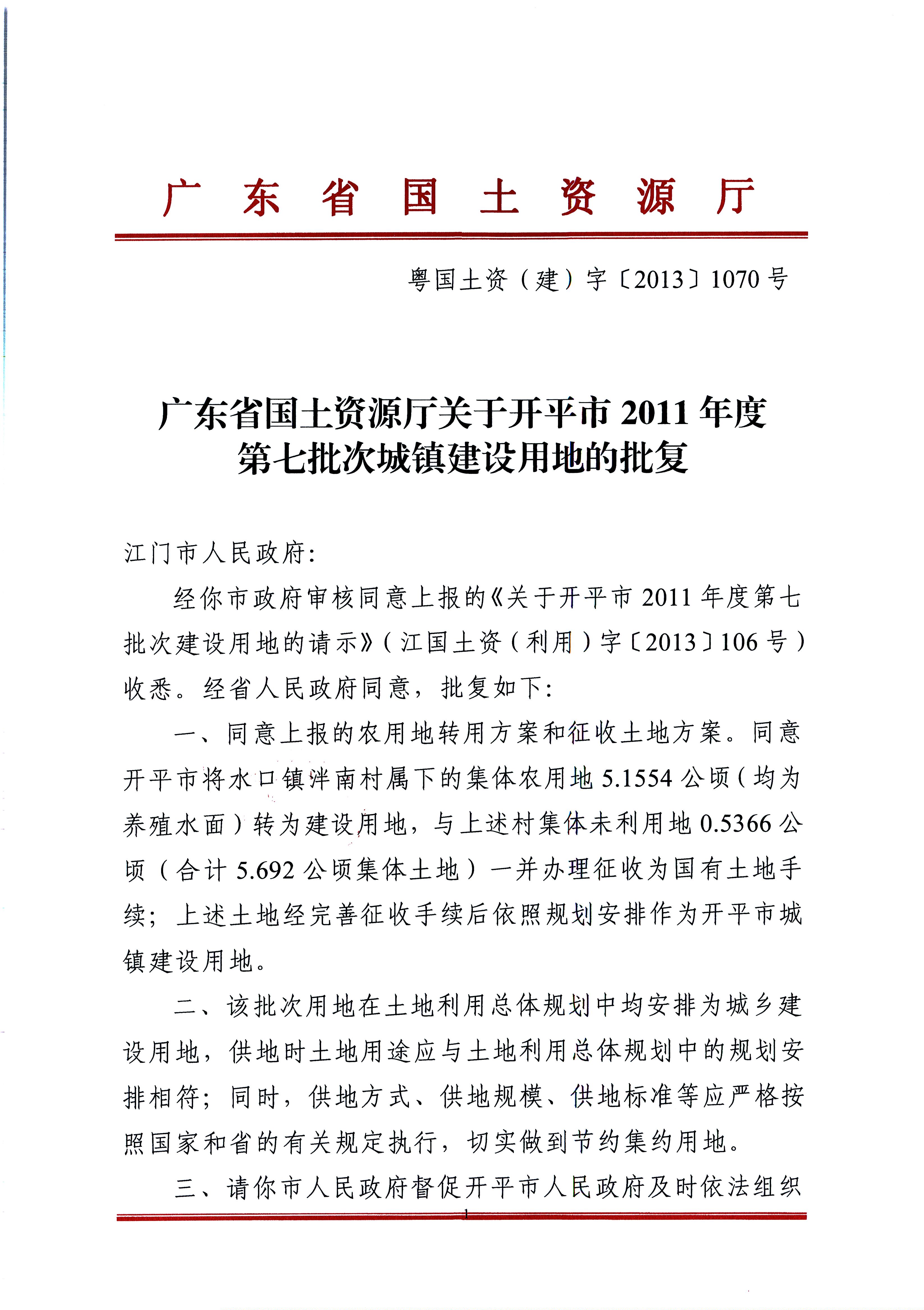開平市2011年度第七批次城鎮(zhèn)建設(shè)用地的批復(fù)