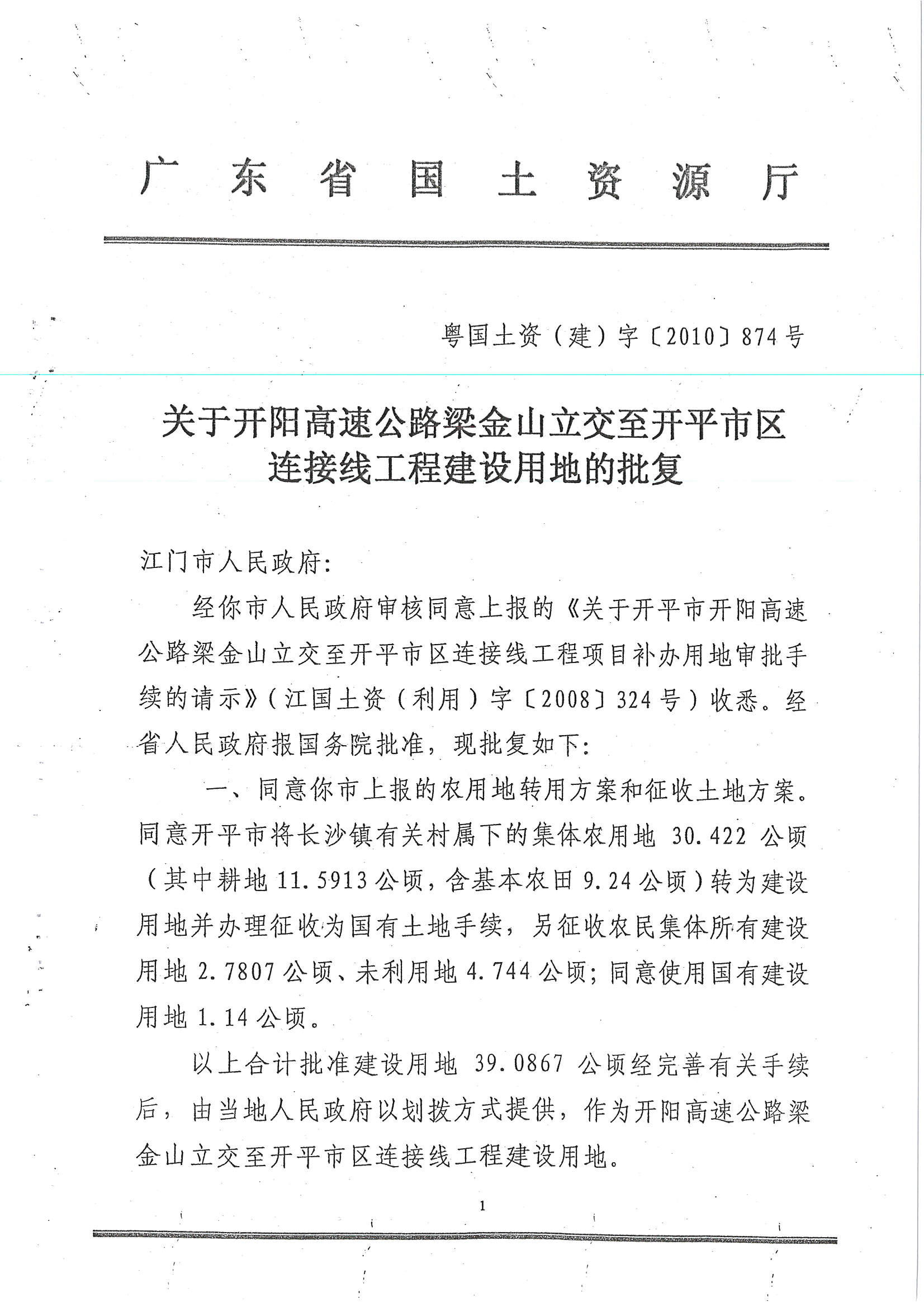 開陽高速公路梁金山立交至開平市區(qū)連接線工程建設(shè)用地的批復(fù)