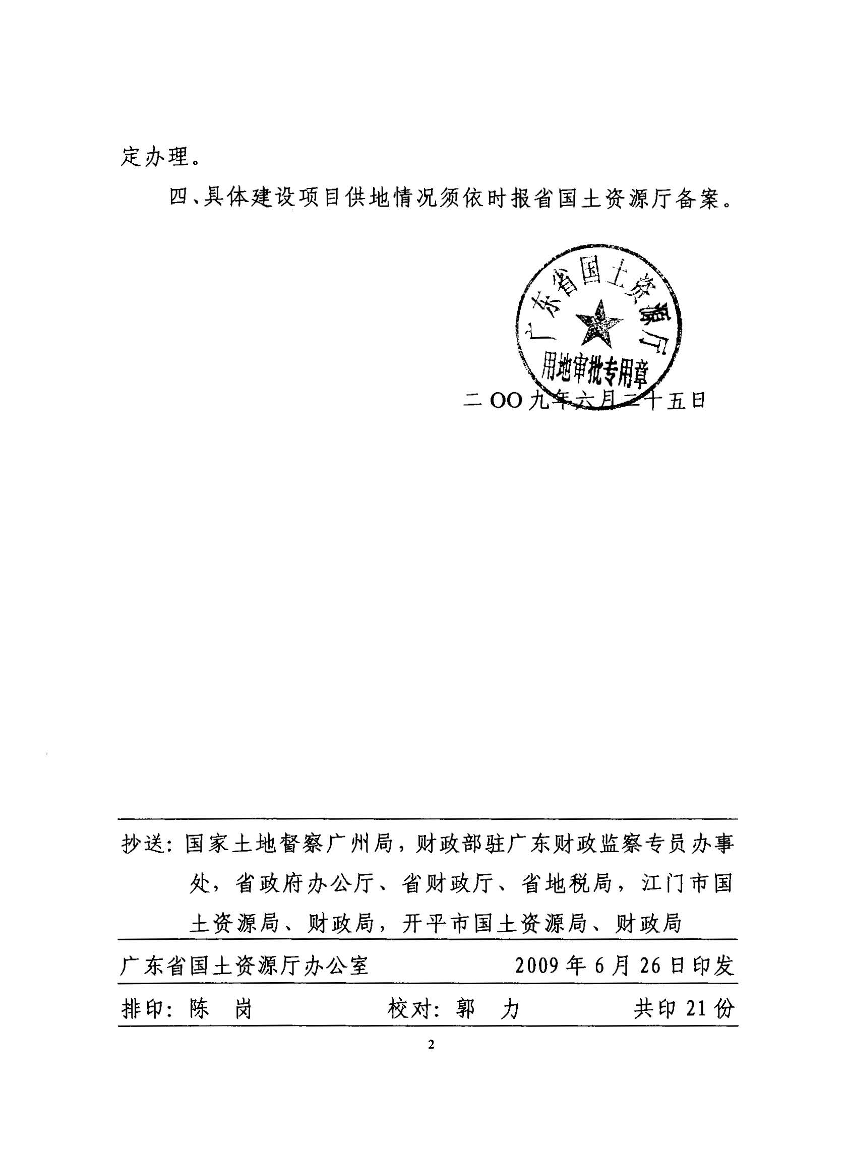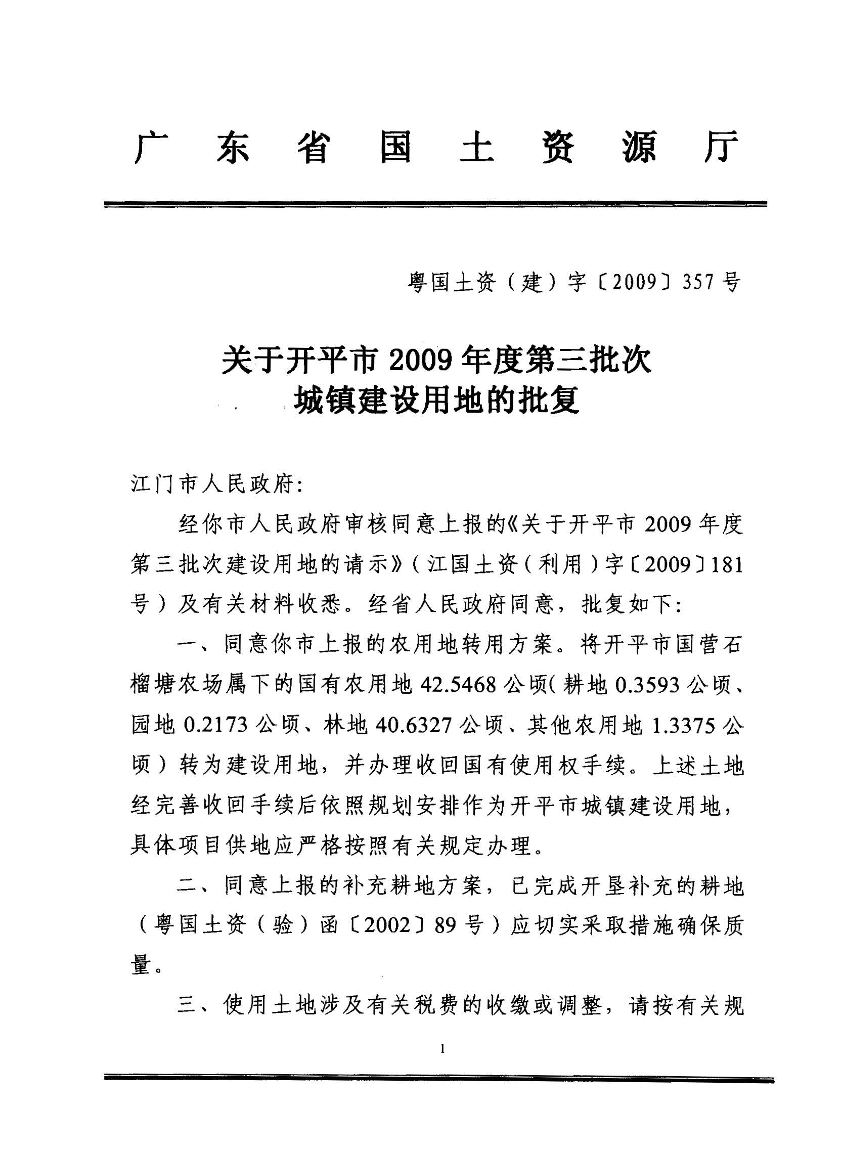 開(kāi)平市2009年度第三批次城鎮(zhèn)建設(shè)用地的批復(fù)