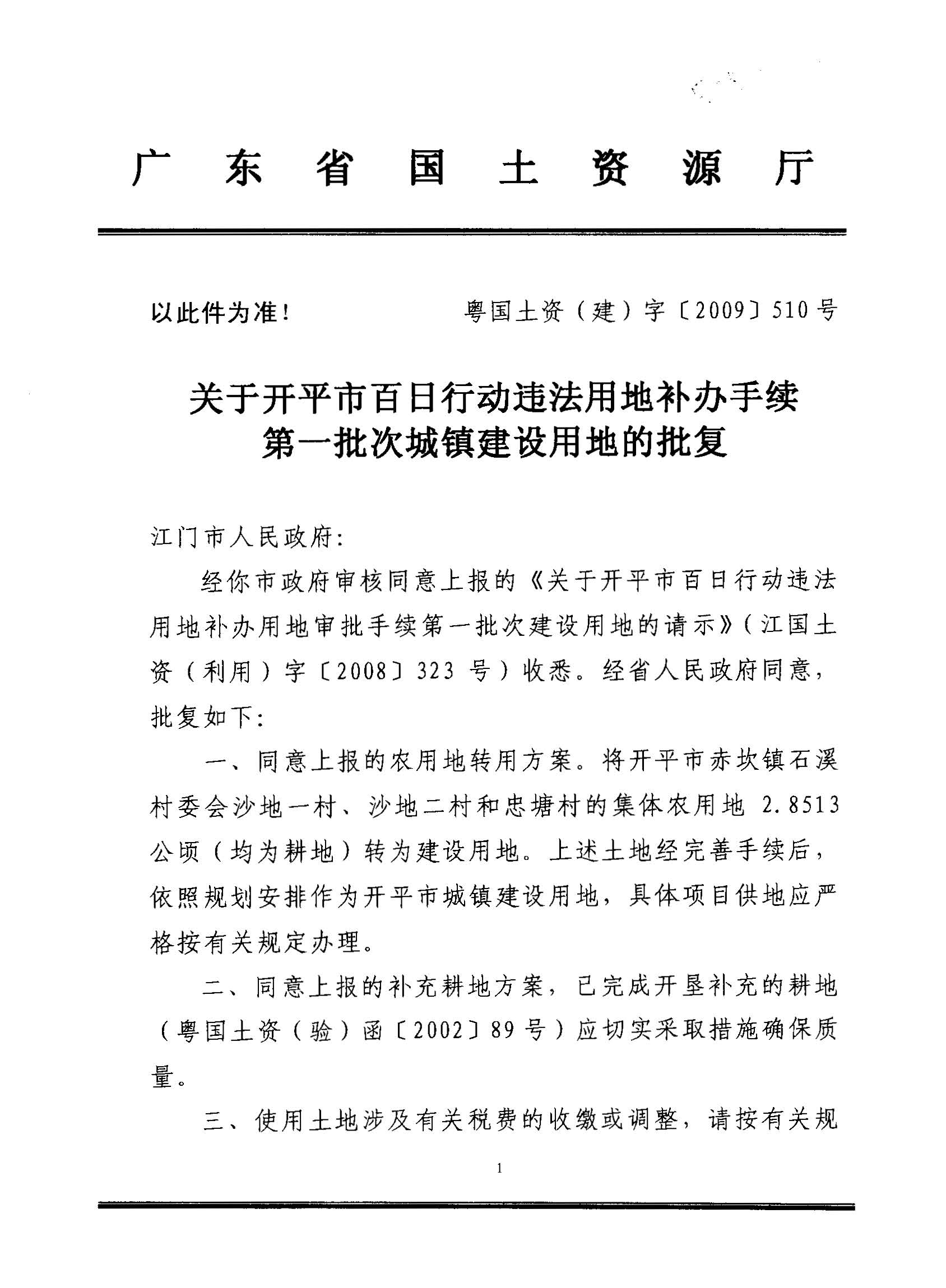 開平市百日違法用地補(bǔ)辦手續(xù)第一批次城鎮(zhèn)建設(shè)用地的批復(fù)