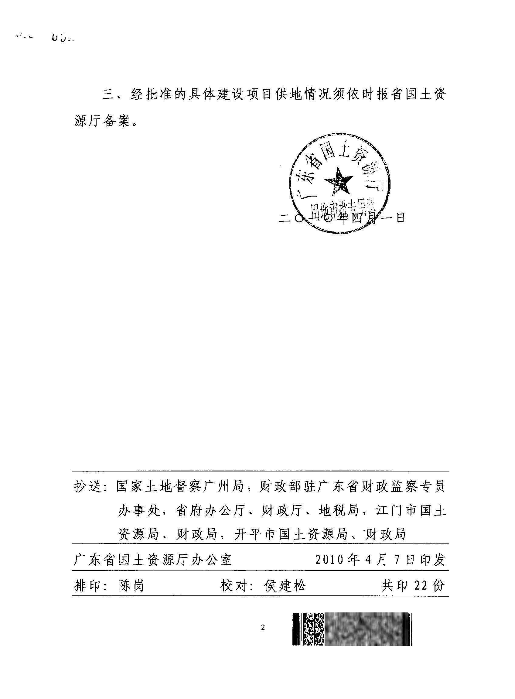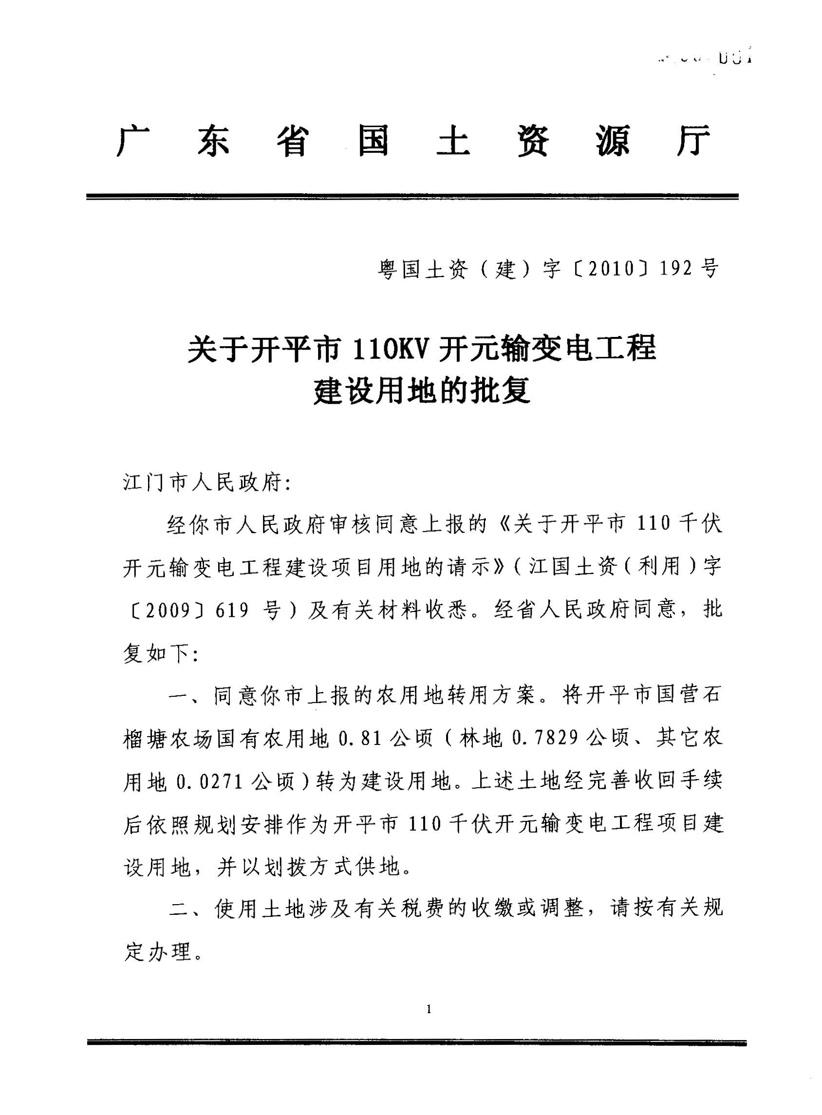 開(kāi)平市110KV開(kāi)元輸變電站工程建設(shè)用地的批復(fù)