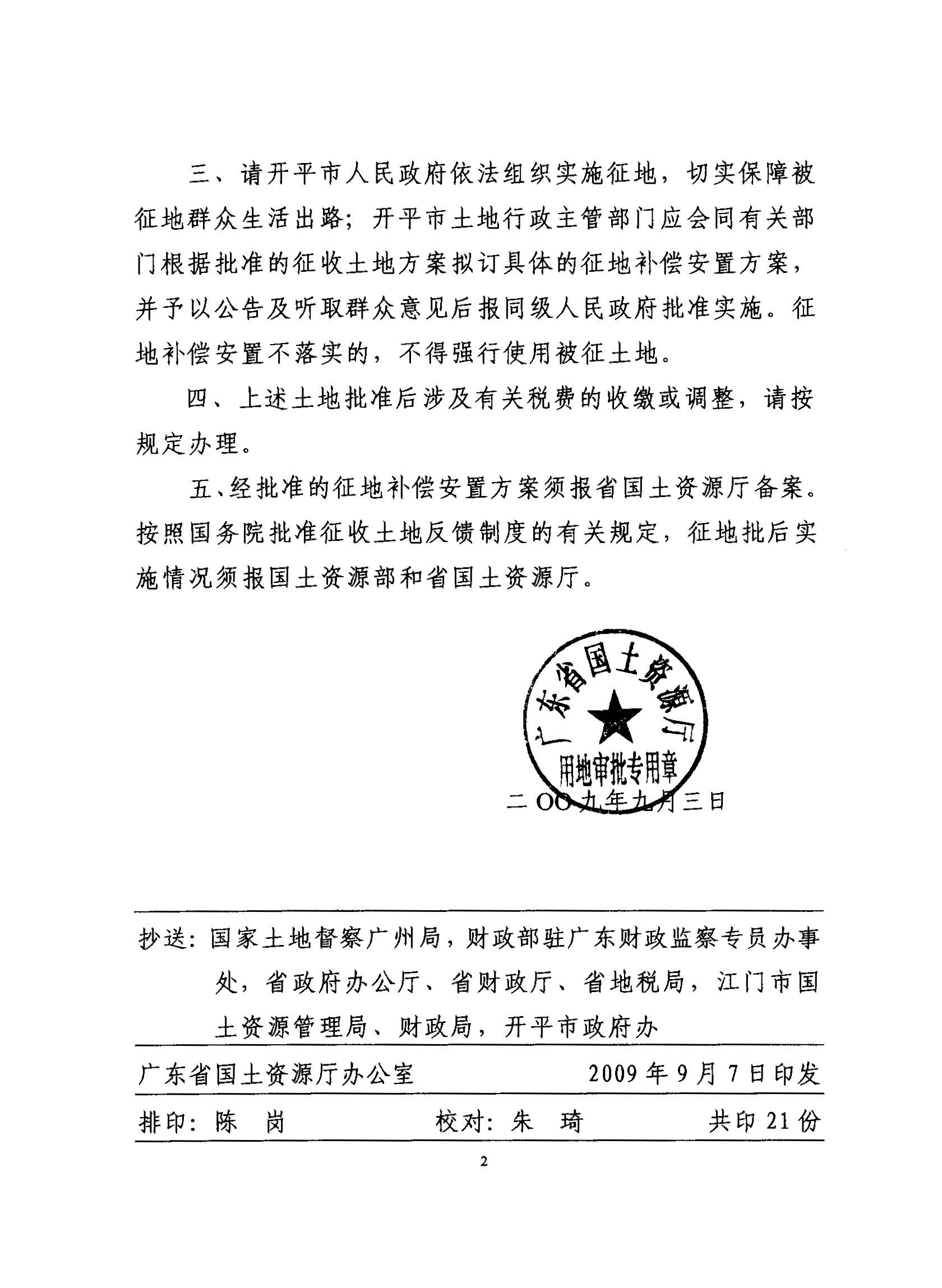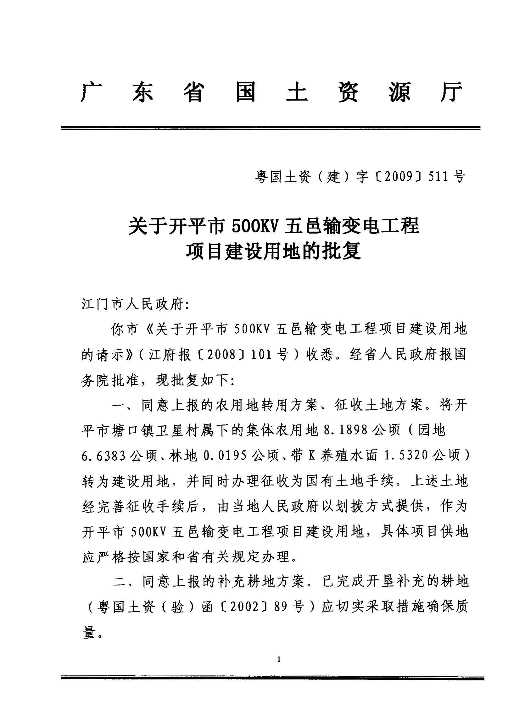開平市500KV五邑輸變電工程項目建設(shè)用地的批復(fù)