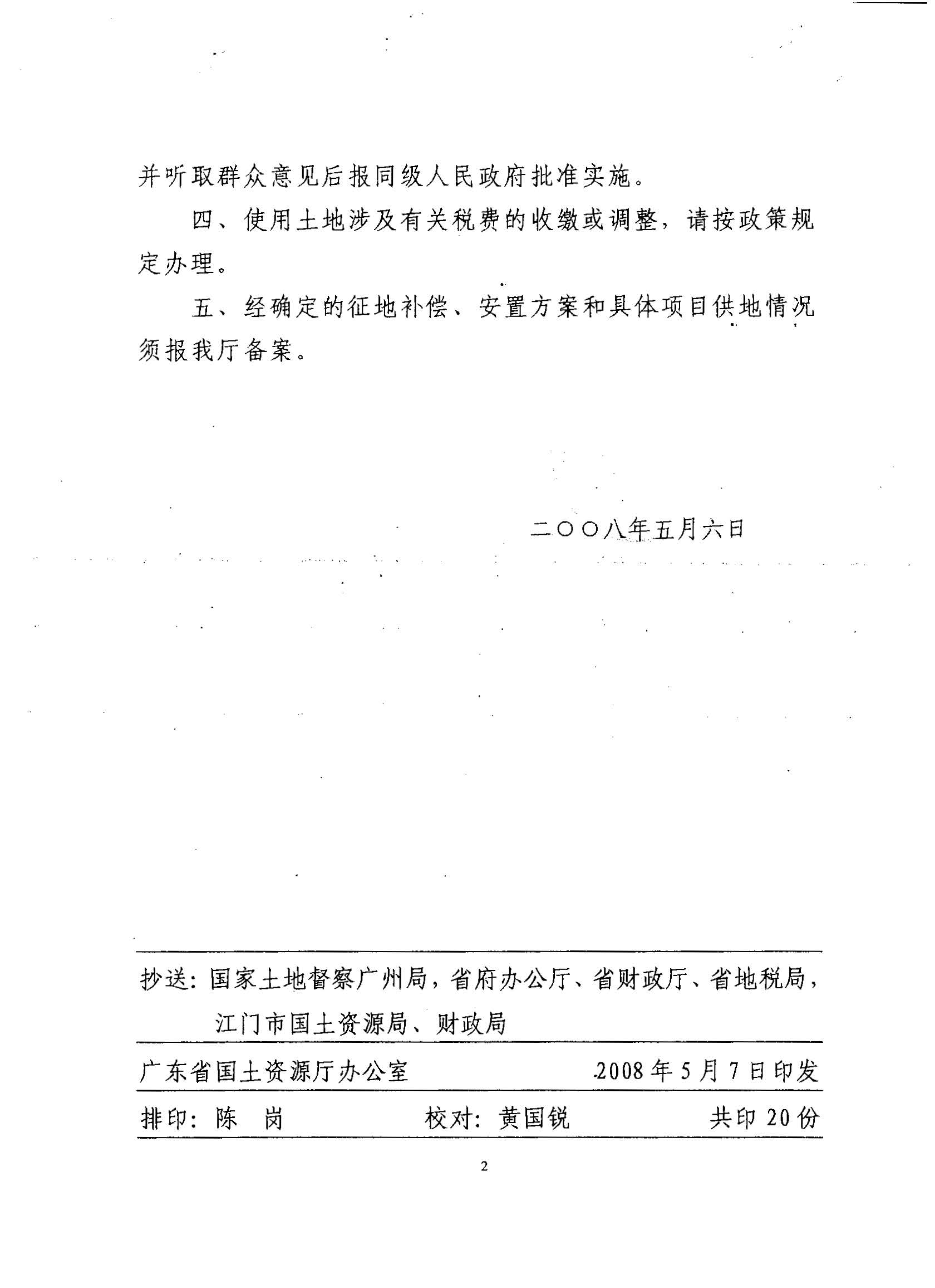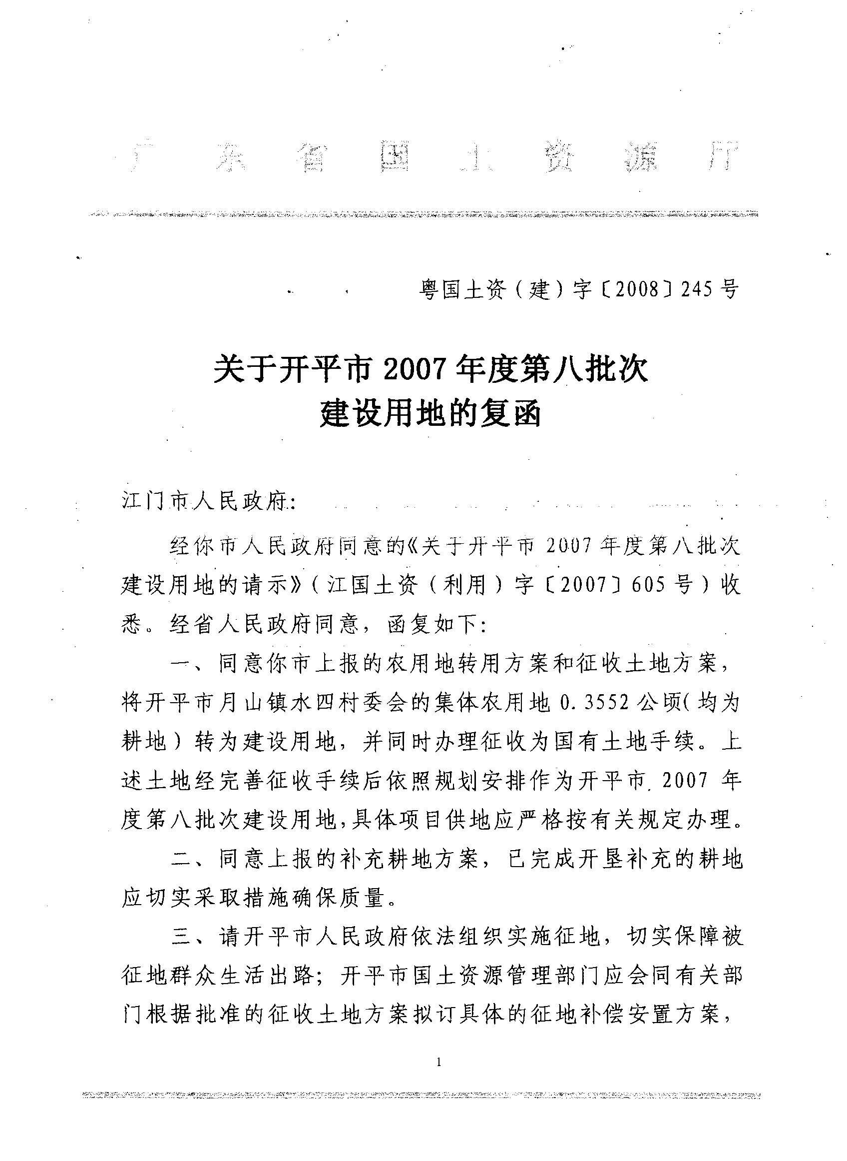 開(kāi)平市2007年度第八批次建設(shè)用地的復(fù)函