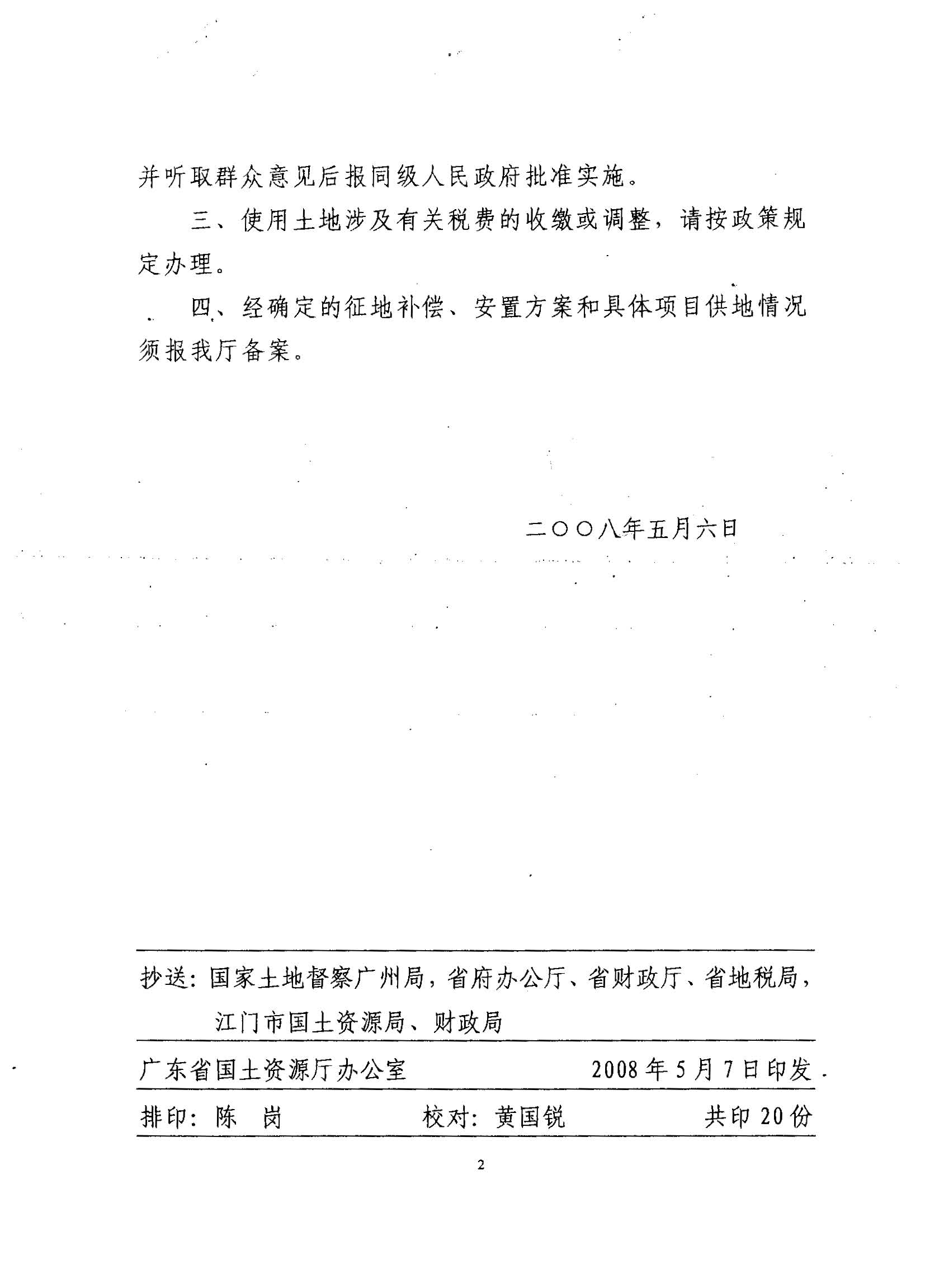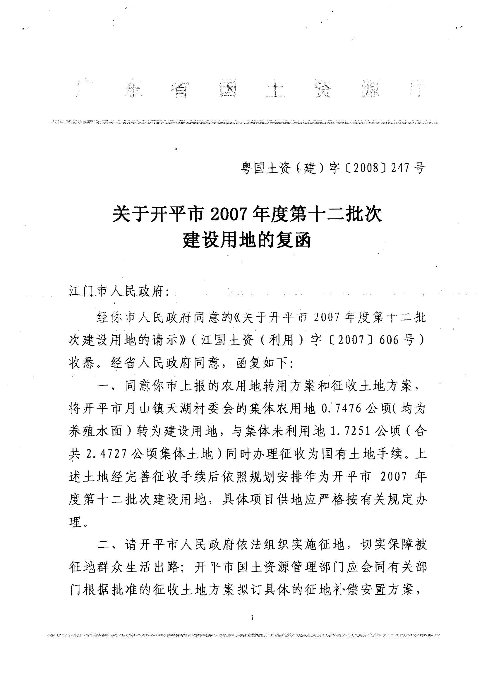 開(kāi)平市2007年度第十二批次建設(shè)用地的復(fù)函