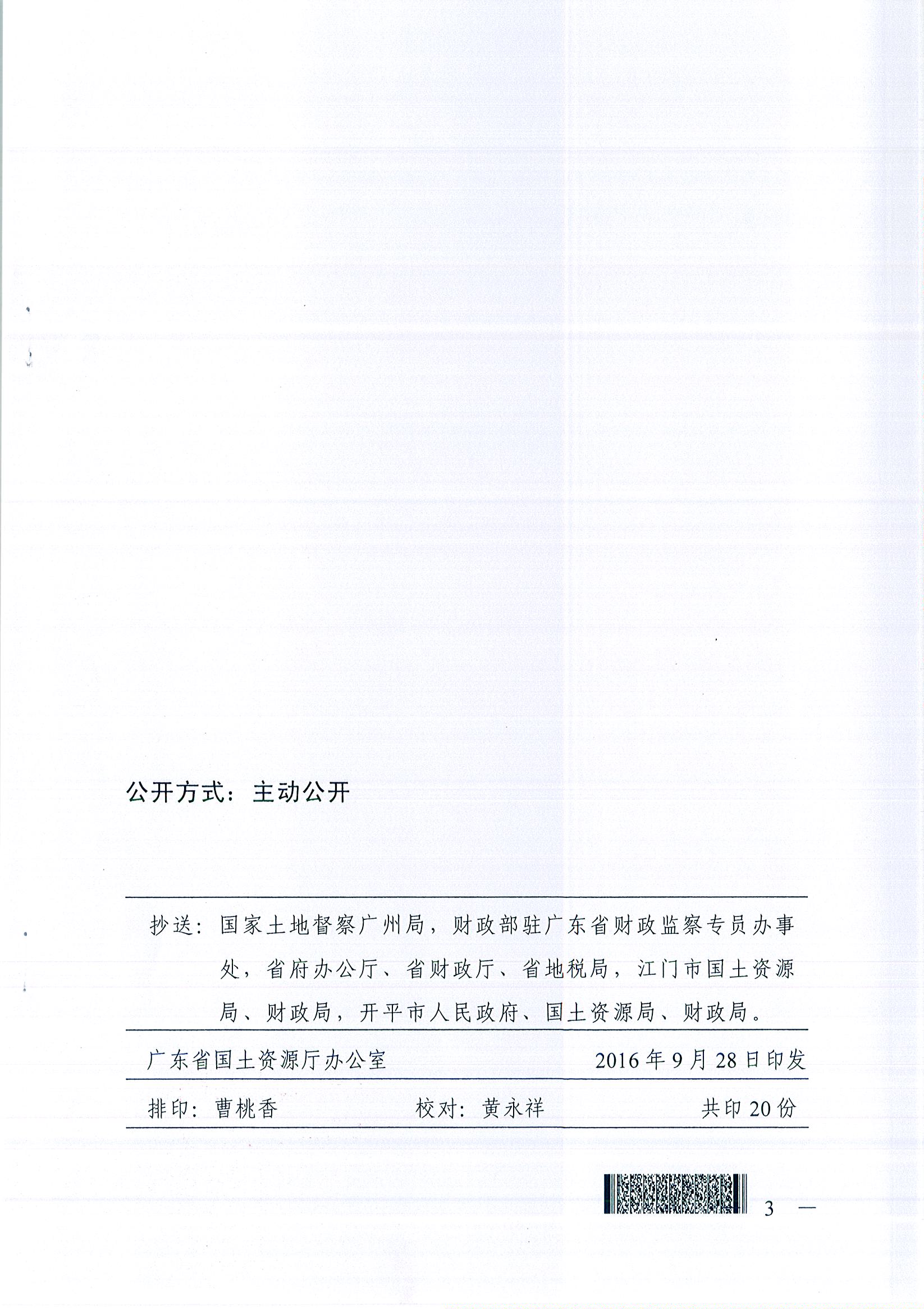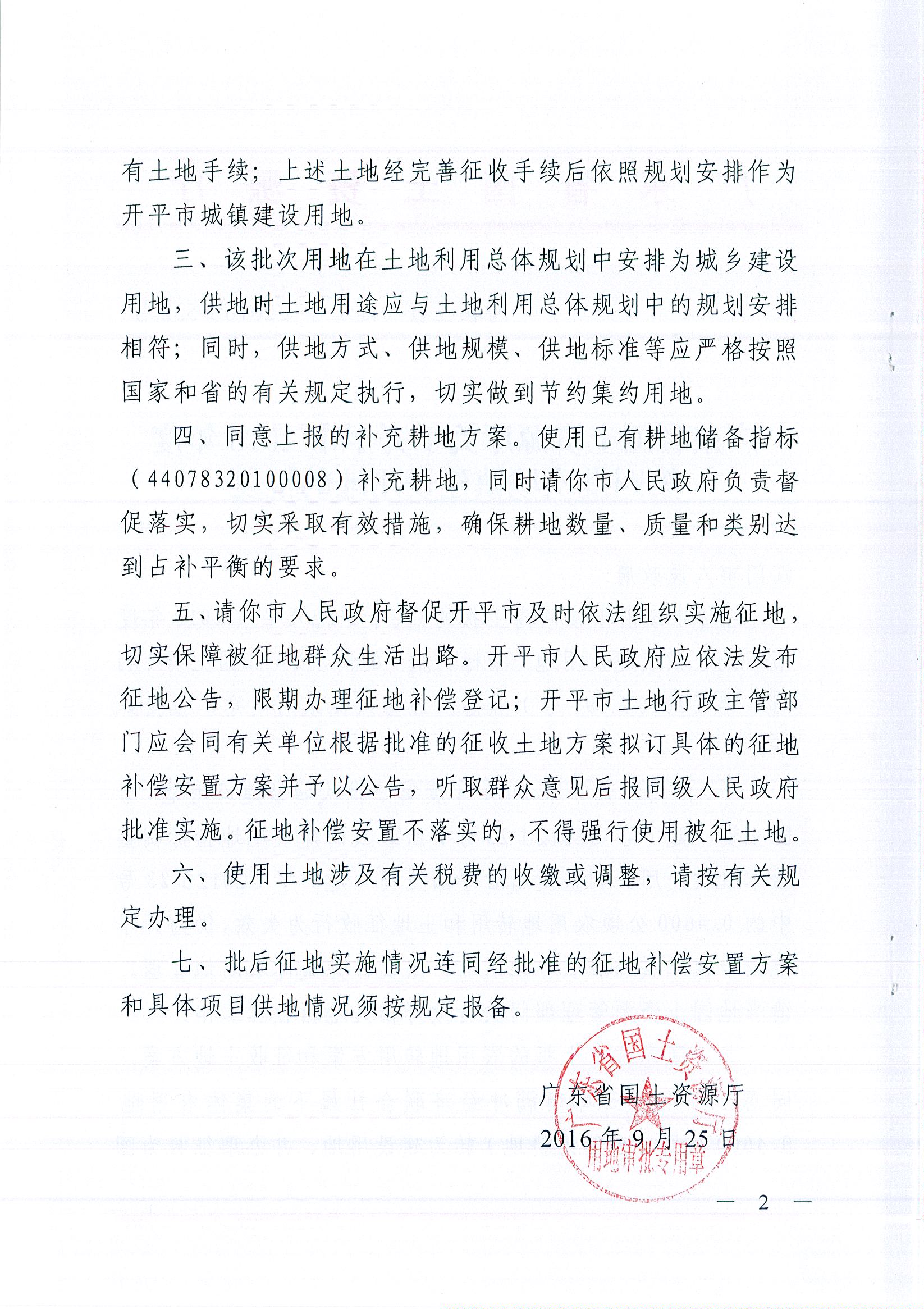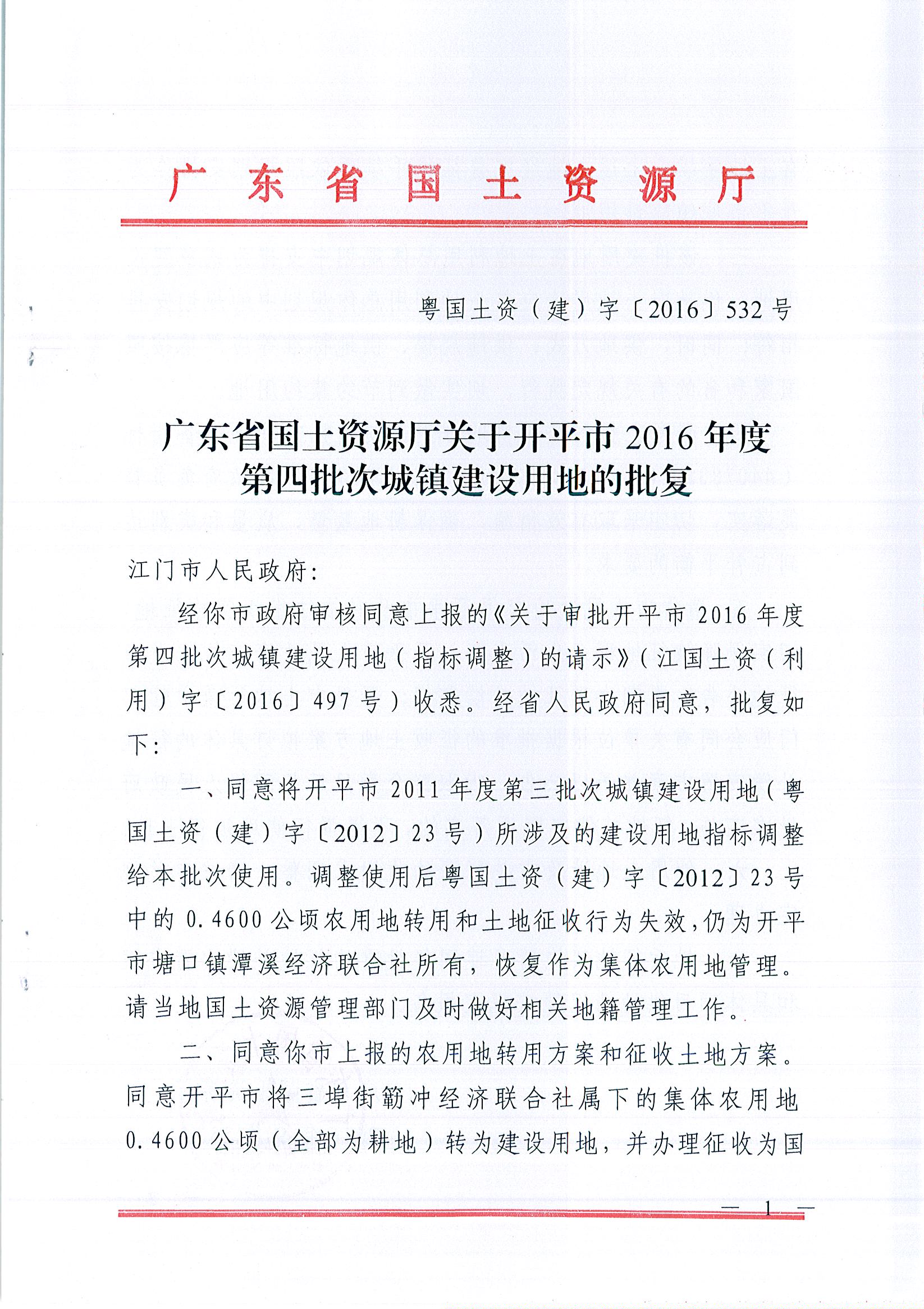 廣東省國土資源廳關(guān)于開平市2016年度第四批次城鎮(zhèn)建設(shè)用地的批復(fù)