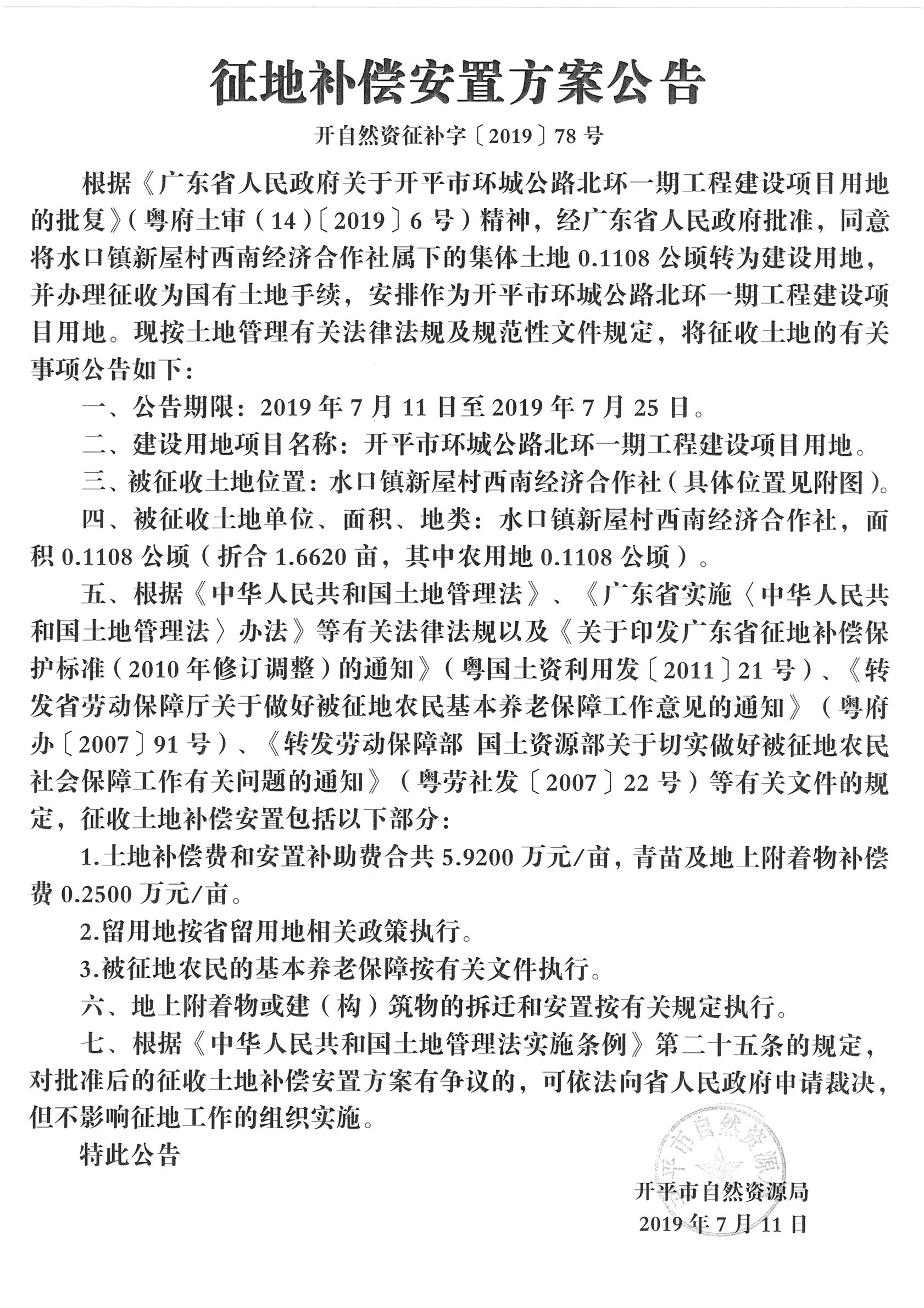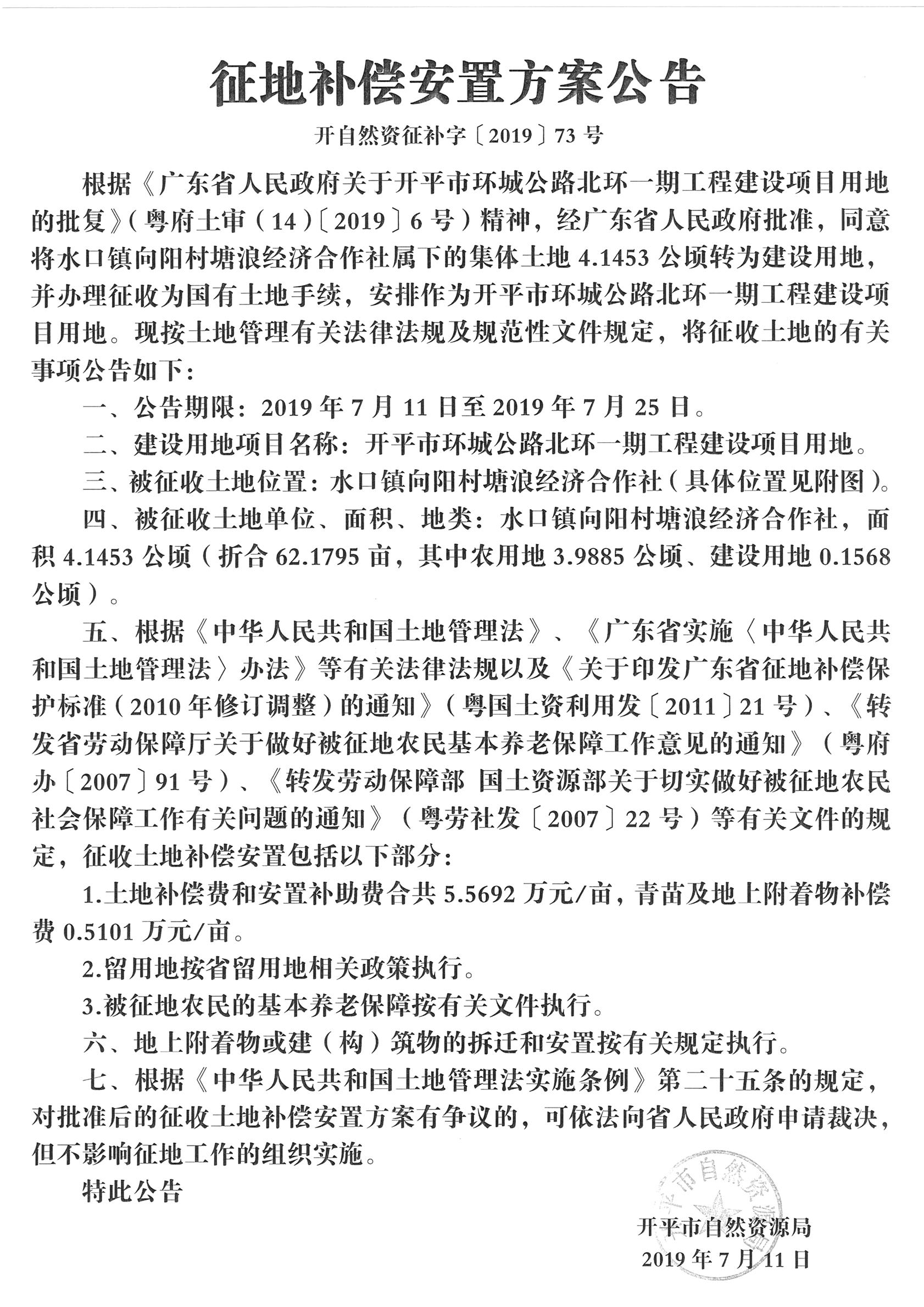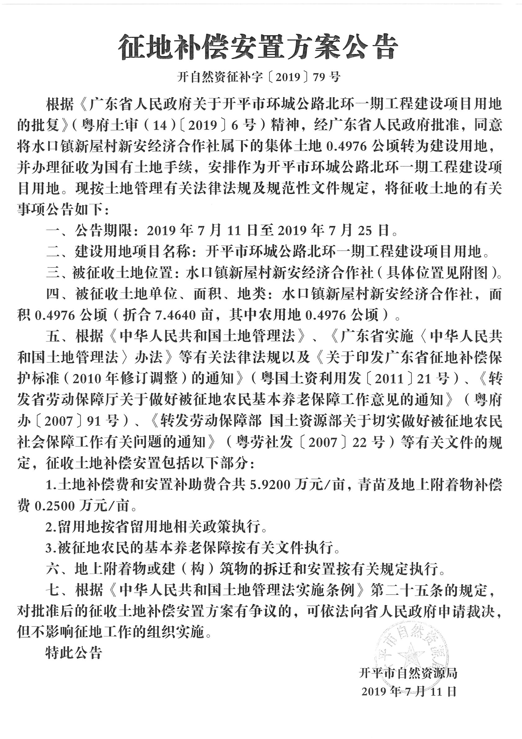 征地補償安置方案公告(開平市環(huán)城公路北環(huán)一期工程建設(shè)項目用地)
