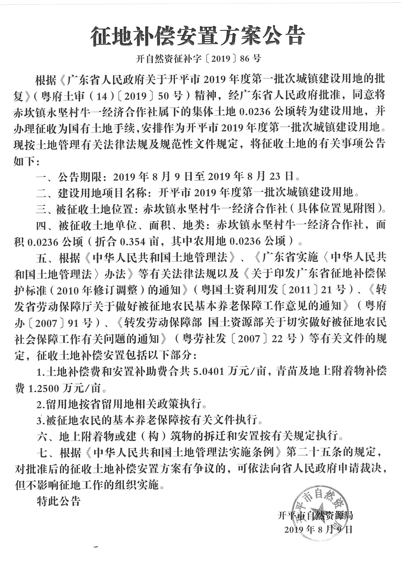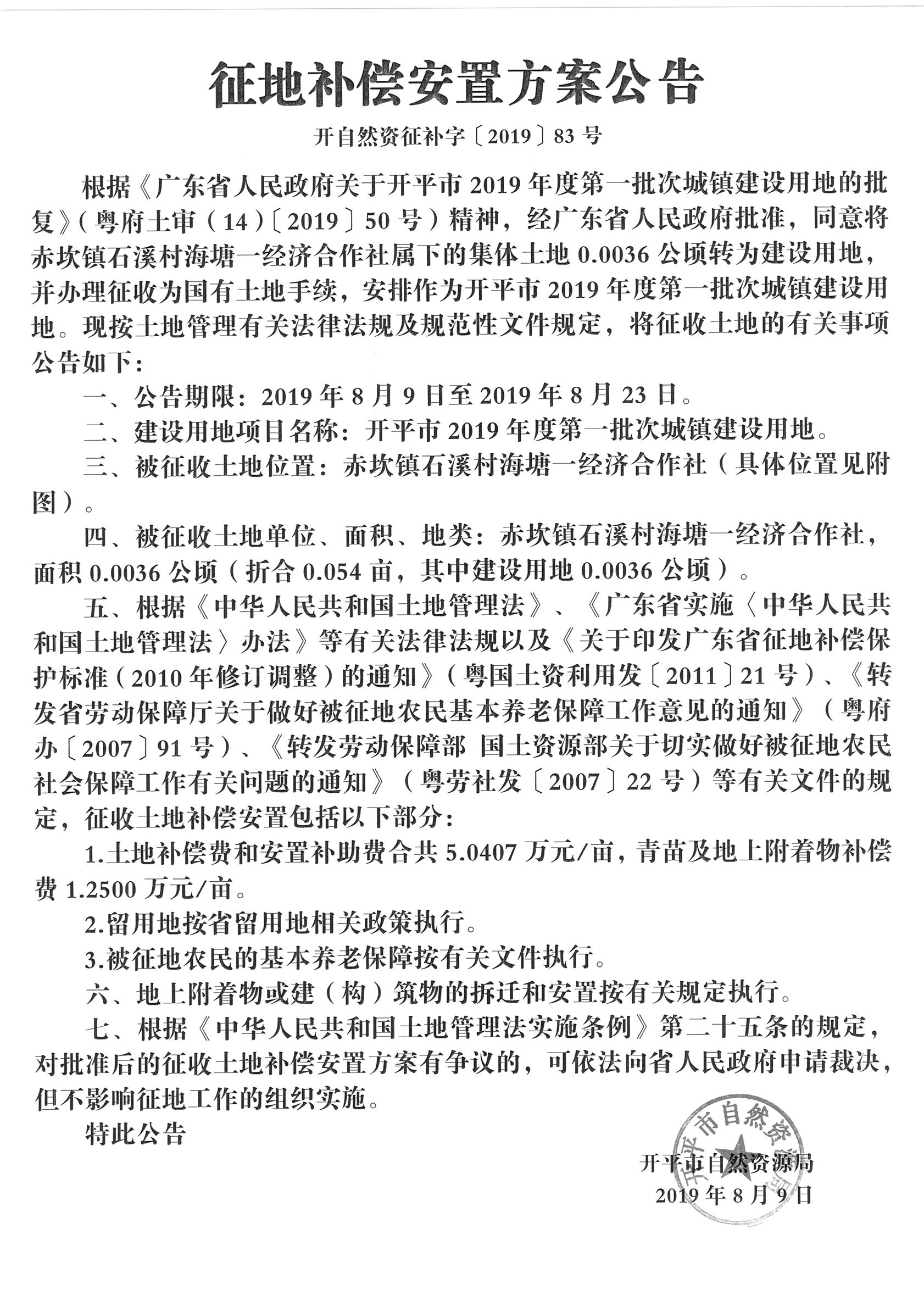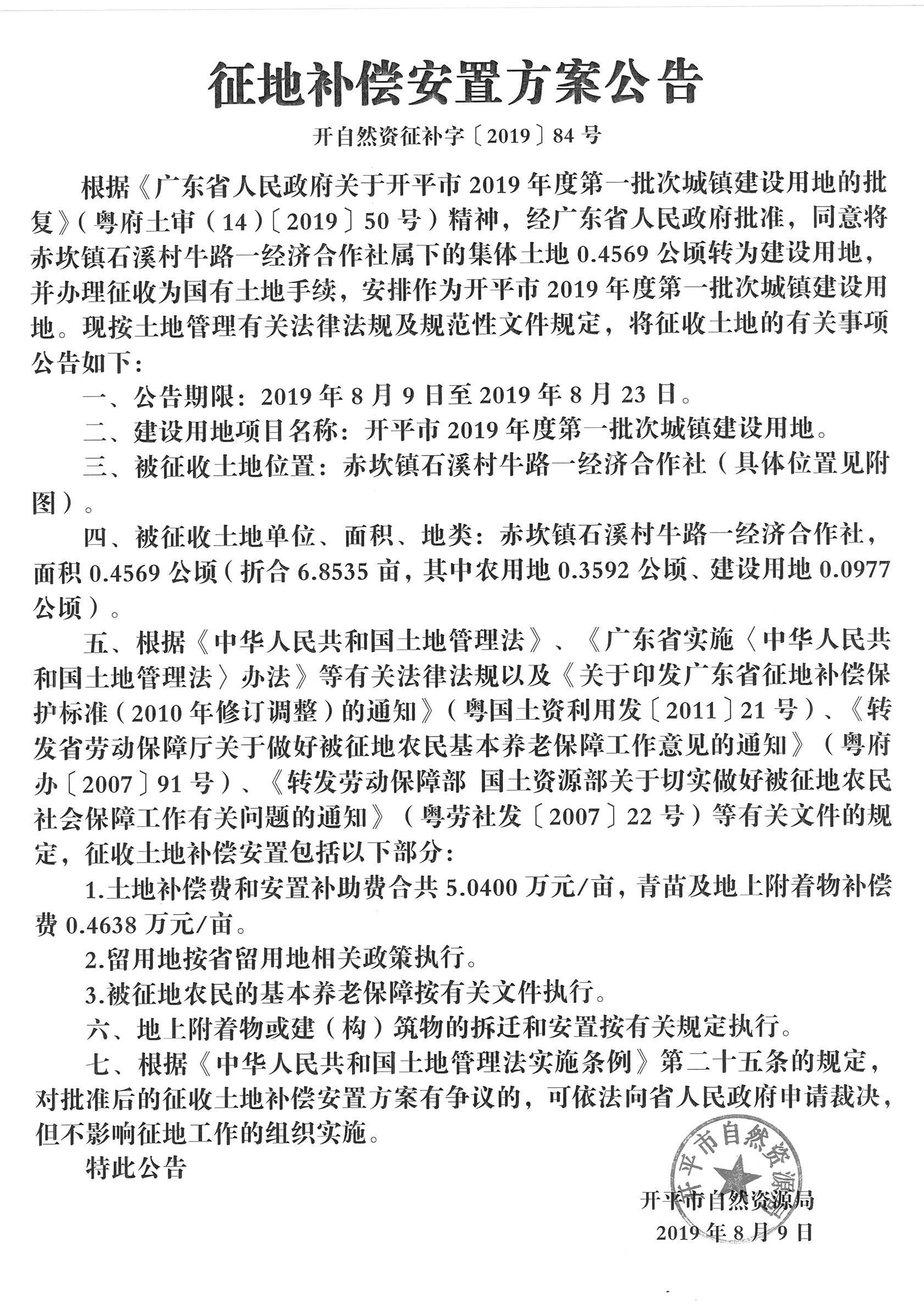 征地補(bǔ)償安置方案公告(開平市2019年度第一批次城鎮(zhèn)建設(shè)用地)