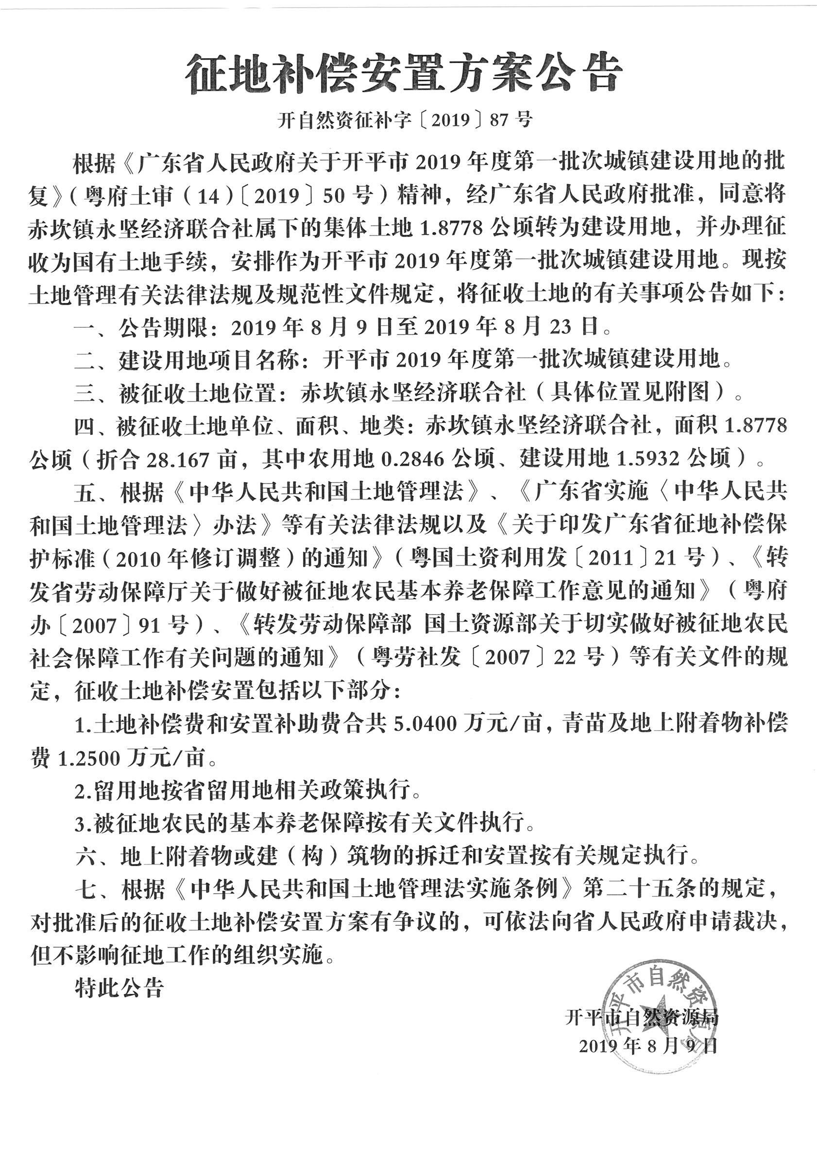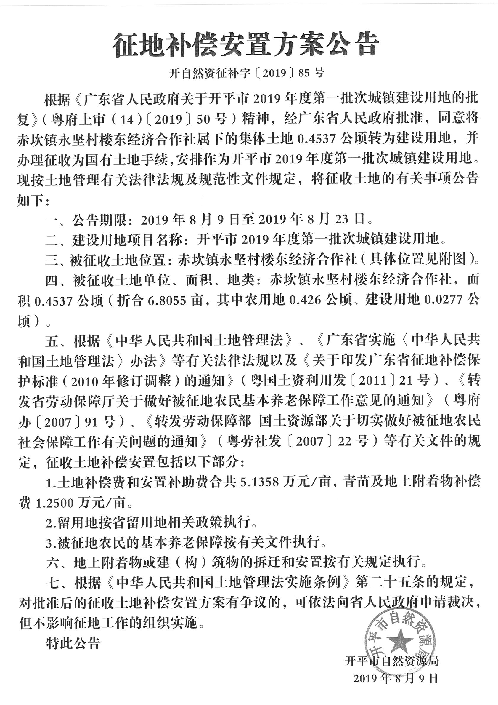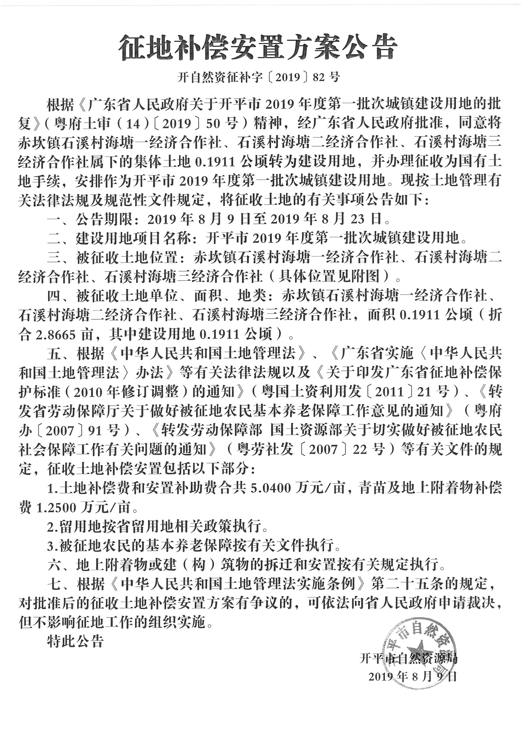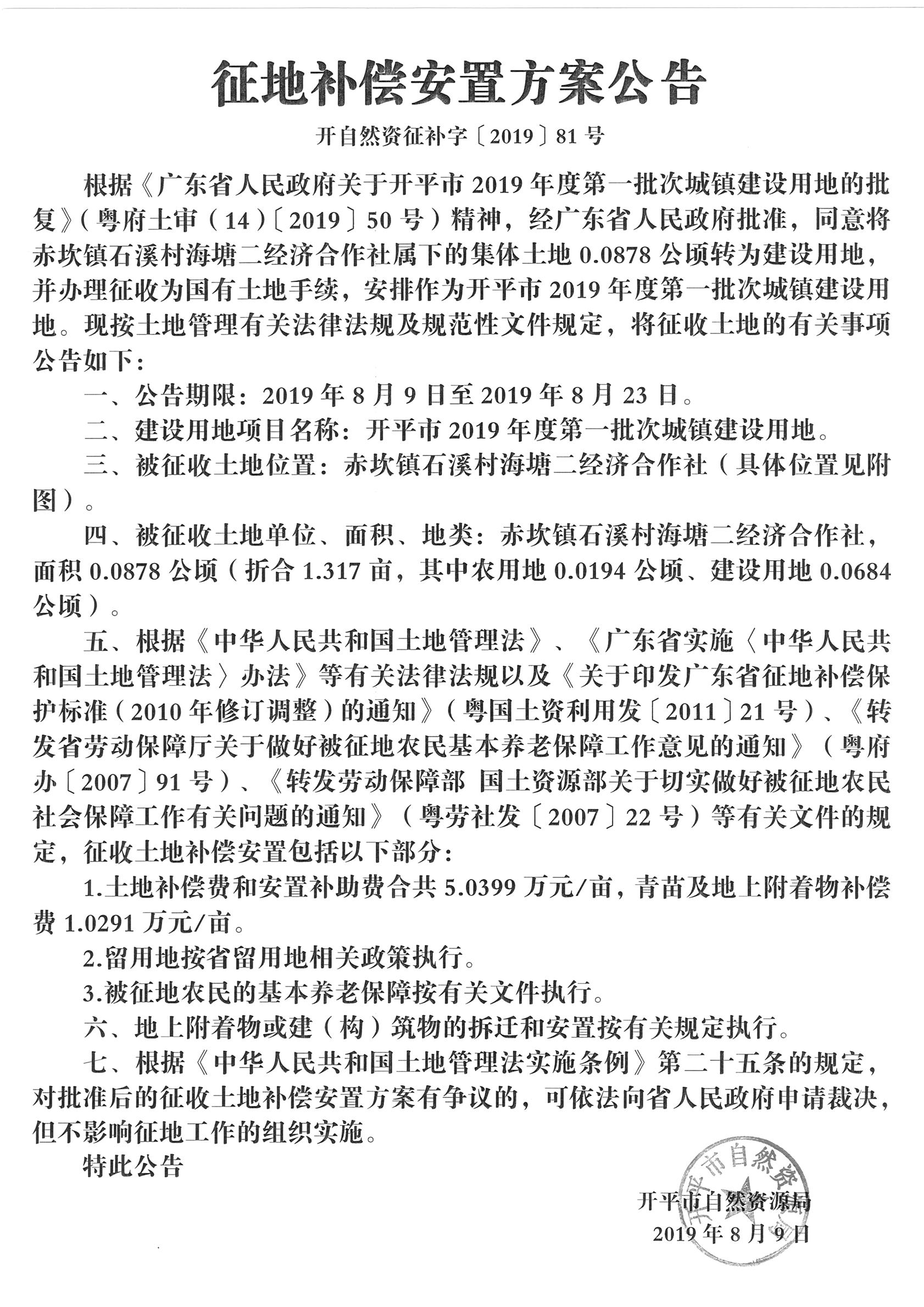 征地補(bǔ)償安置方案公告(開平市2019年度第一批次城鎮(zhèn)建設(shè)用地)