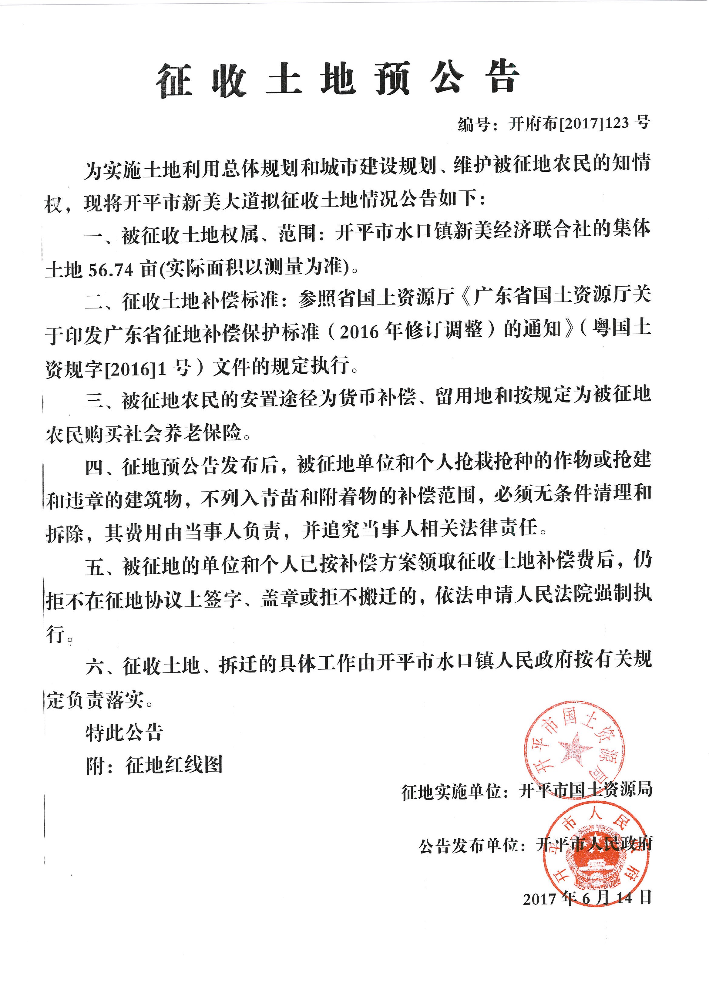 開平市新美大道征收土地預(yù)公告