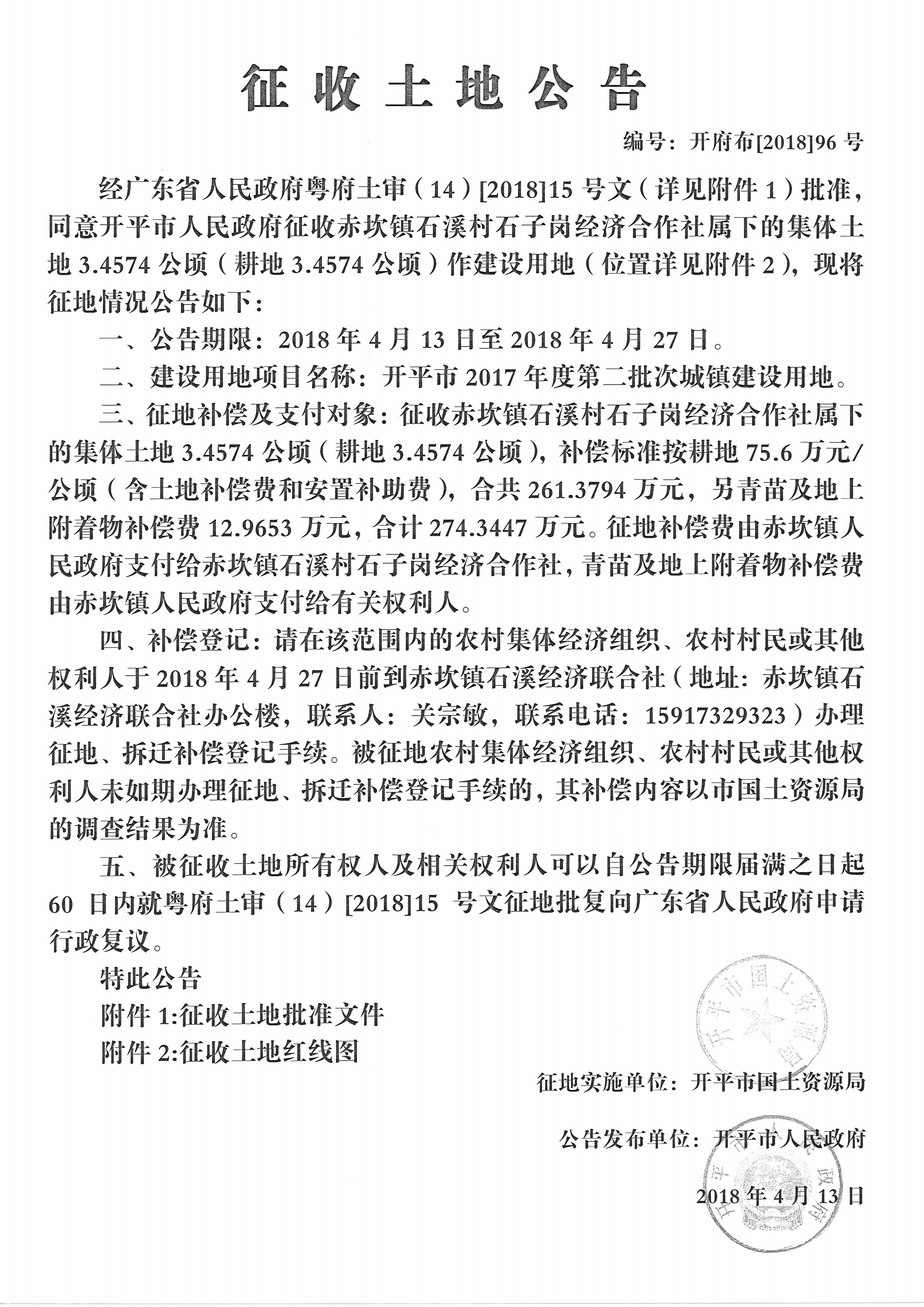 征收土地公告(開平市2017年度第二批次城鎮(zhèn)建設(shè)用地)