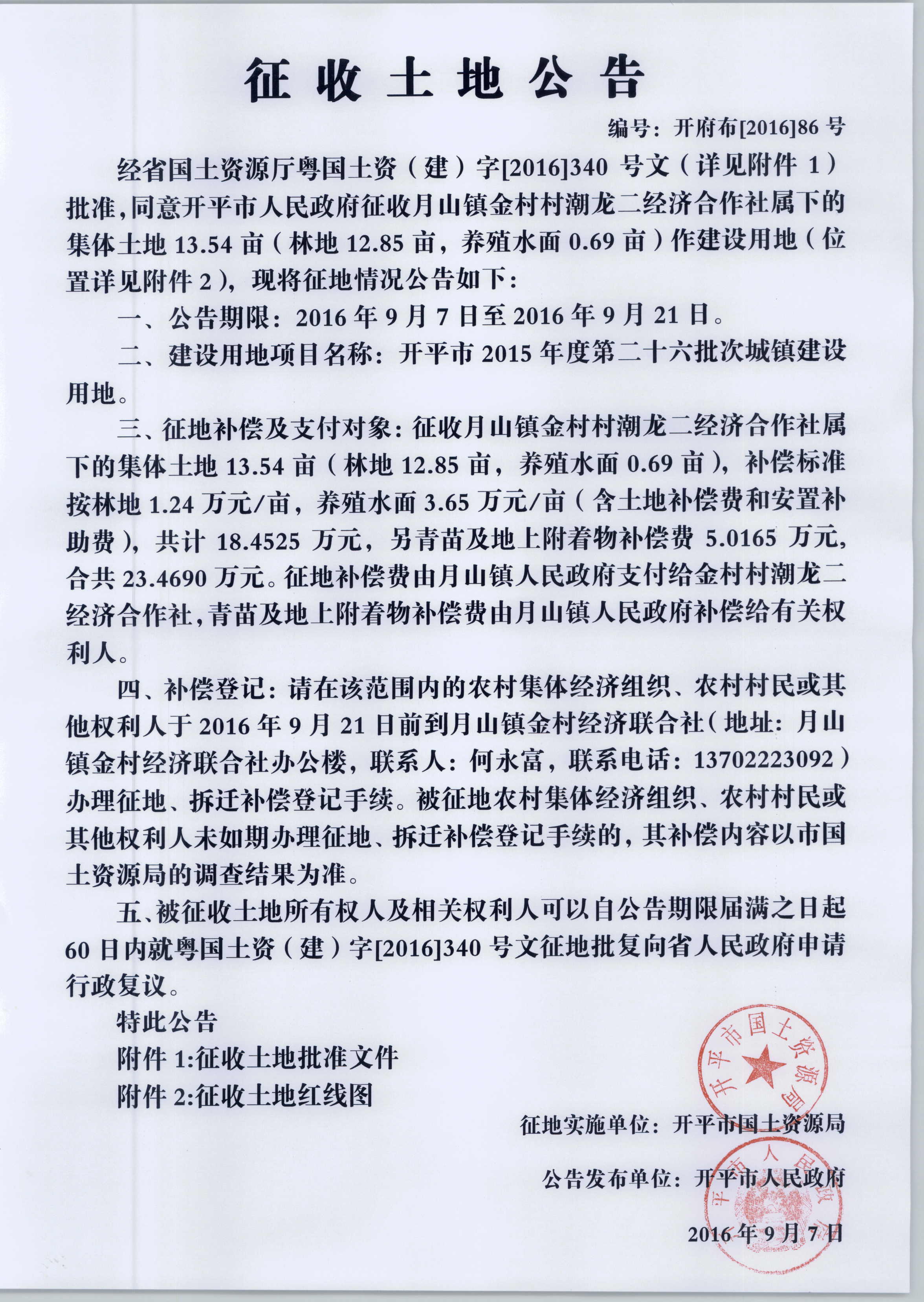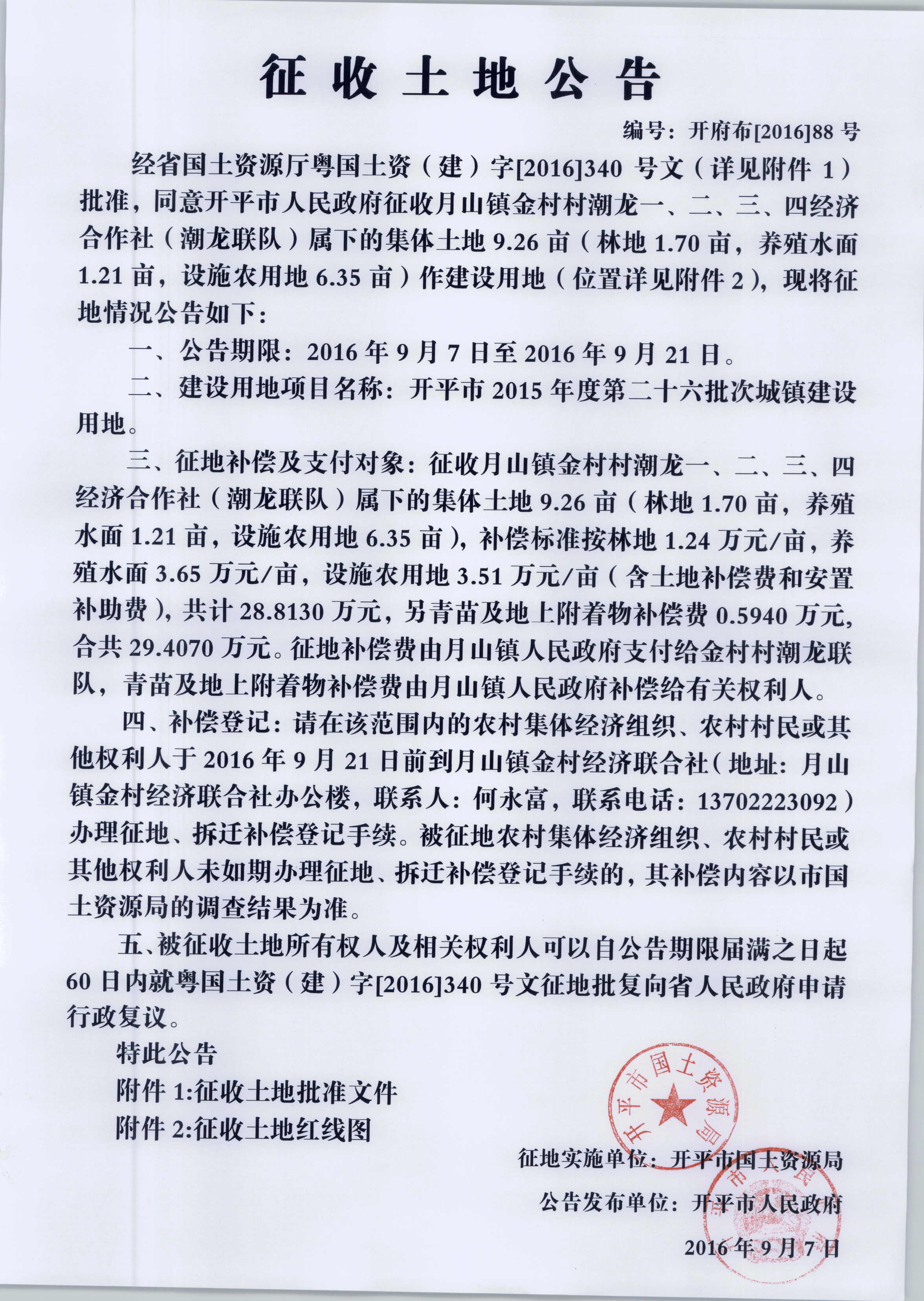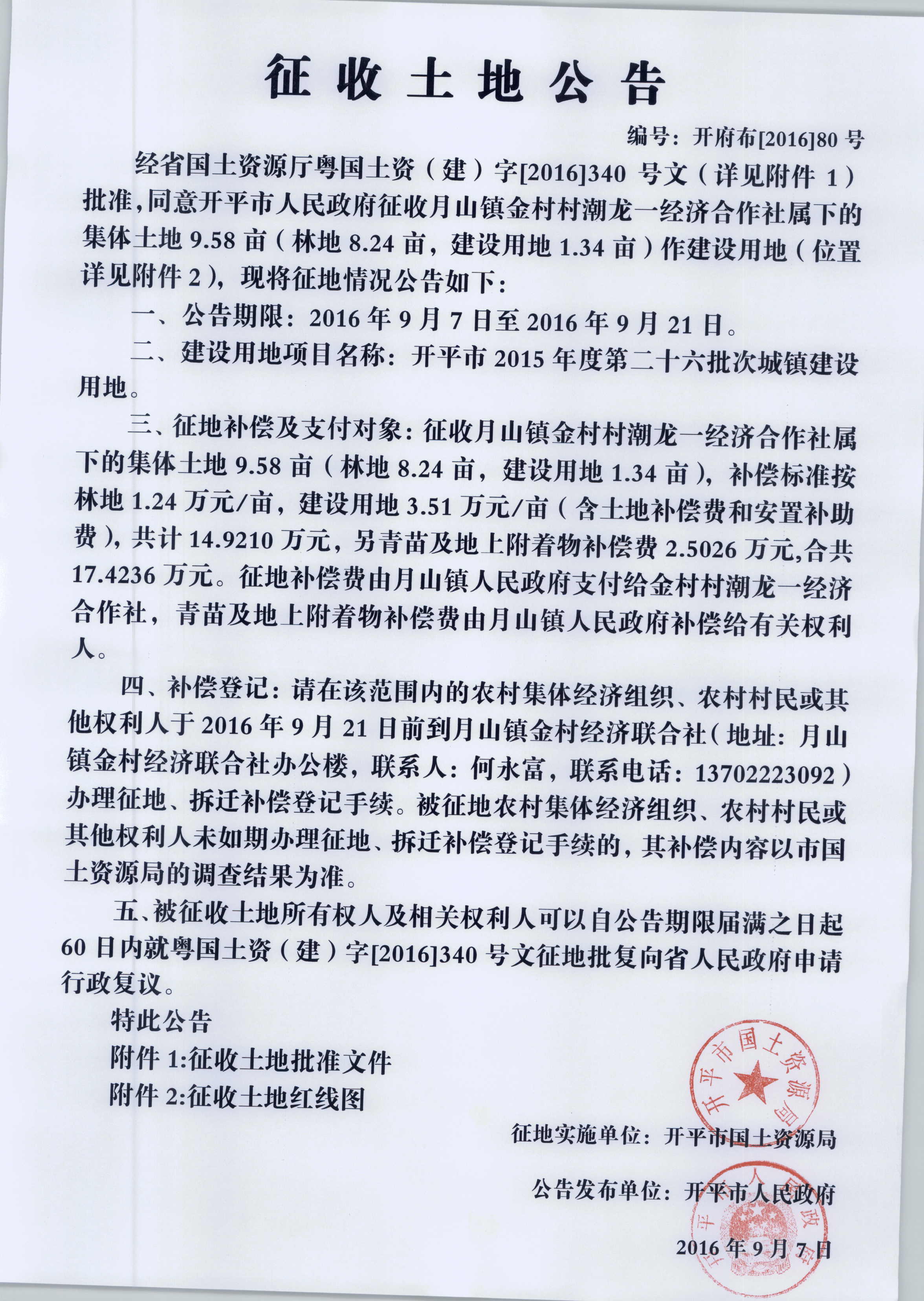 征收土地公告(開平市2015年度第二十六批次城鎮(zhèn)建設用地)