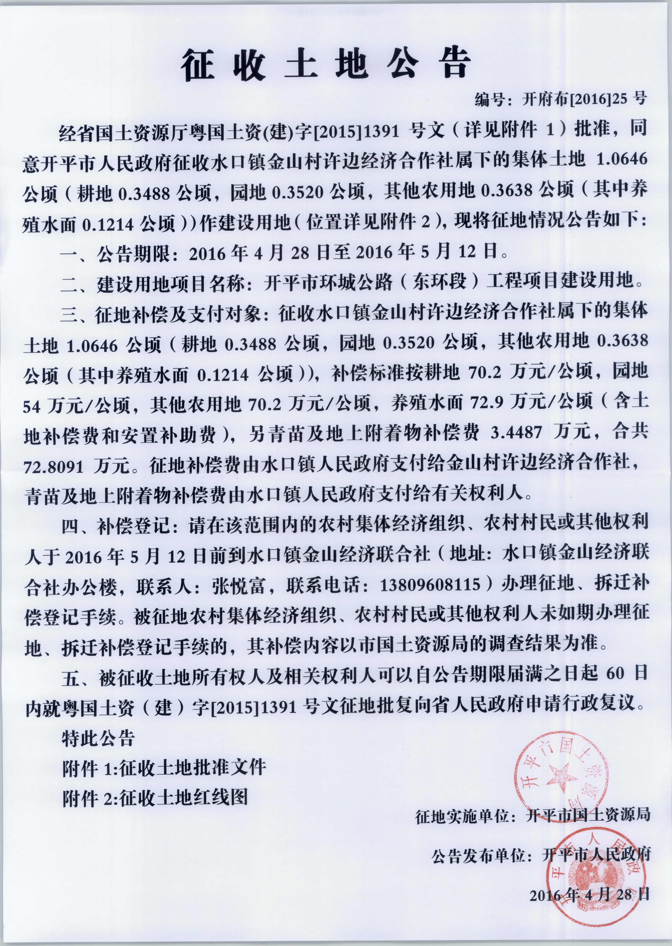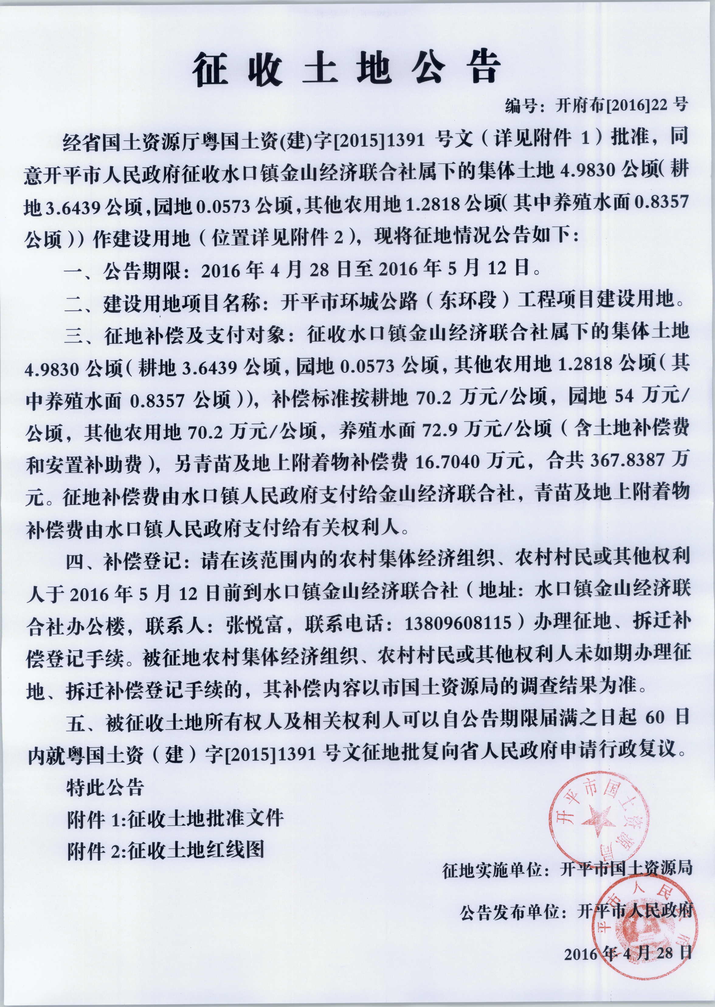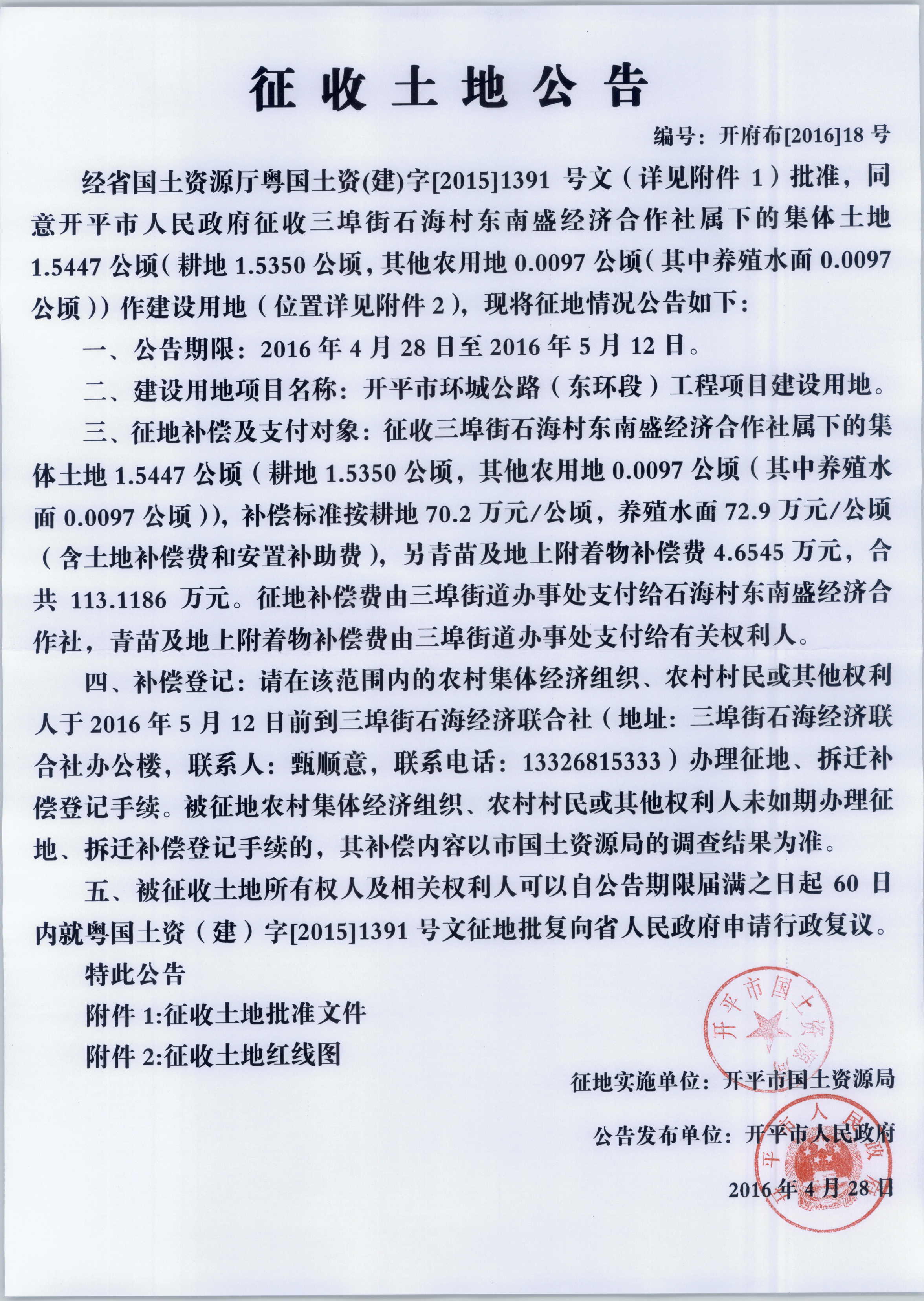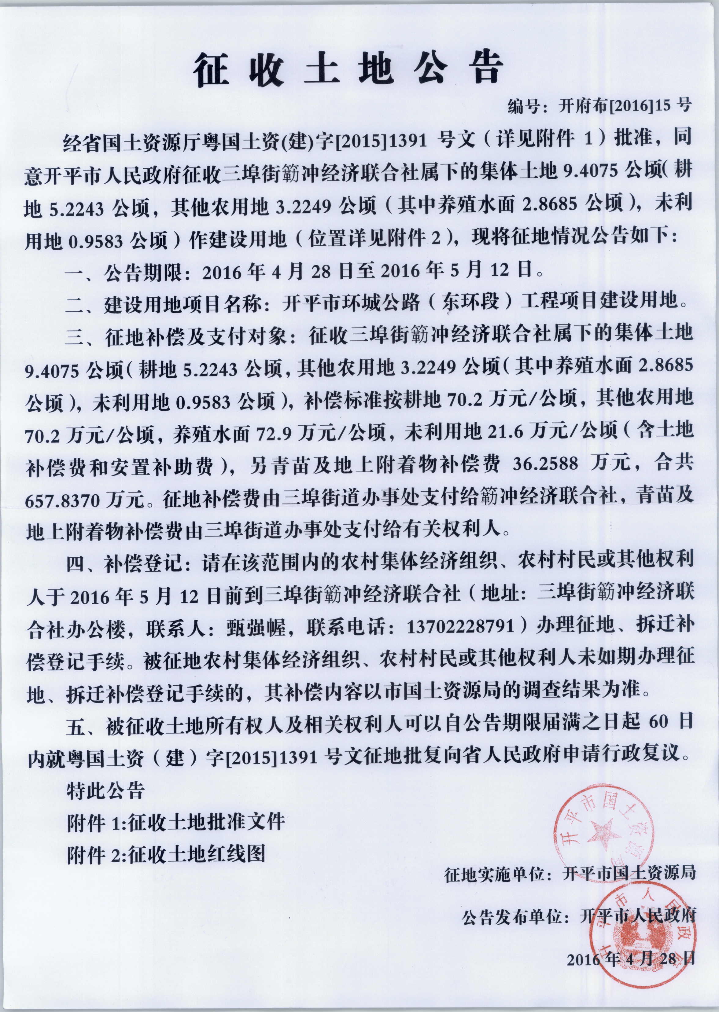 征收土地公告(開平市環(huán)城公路(東環(huán)段)工程項目建設(shè)用地)