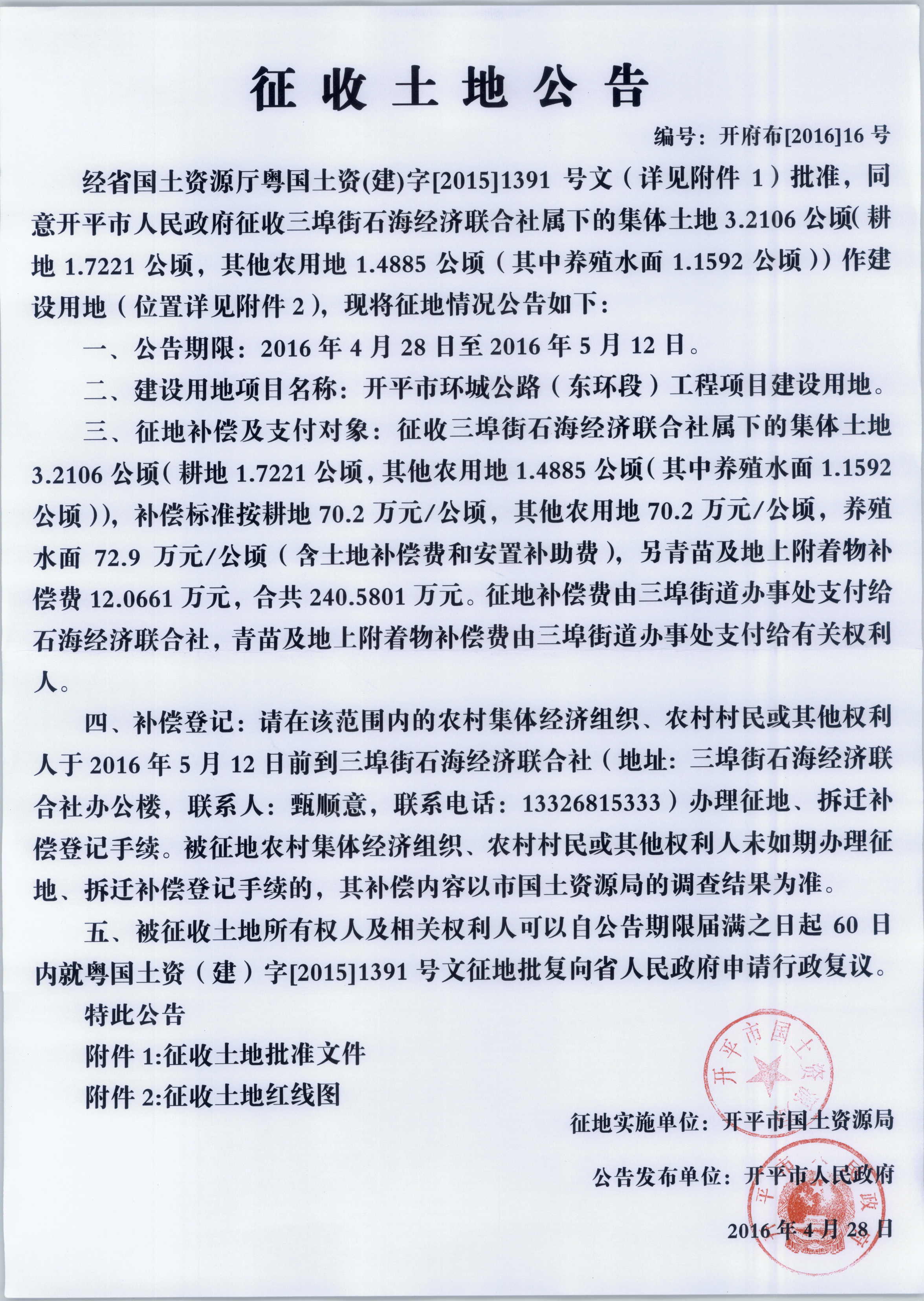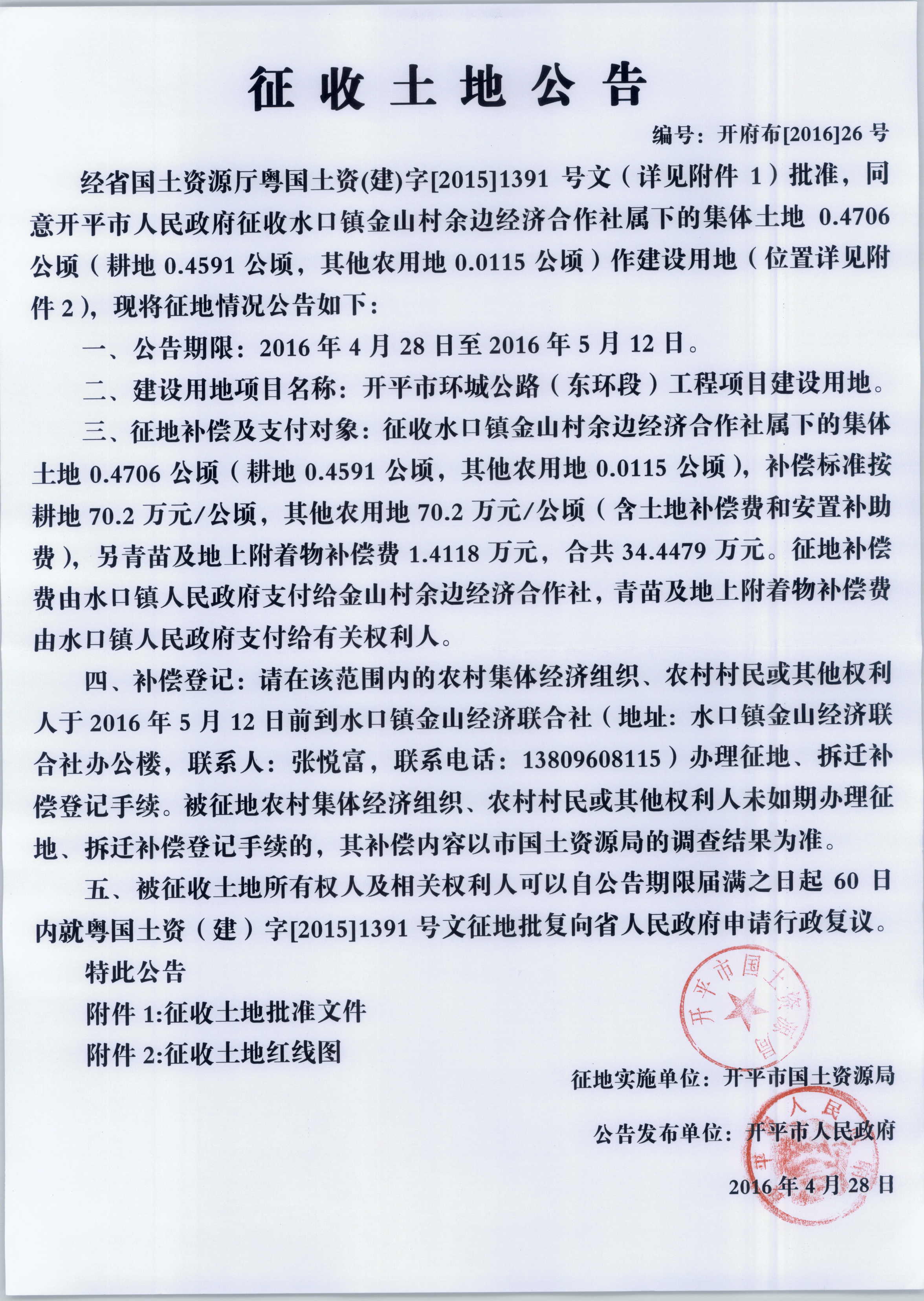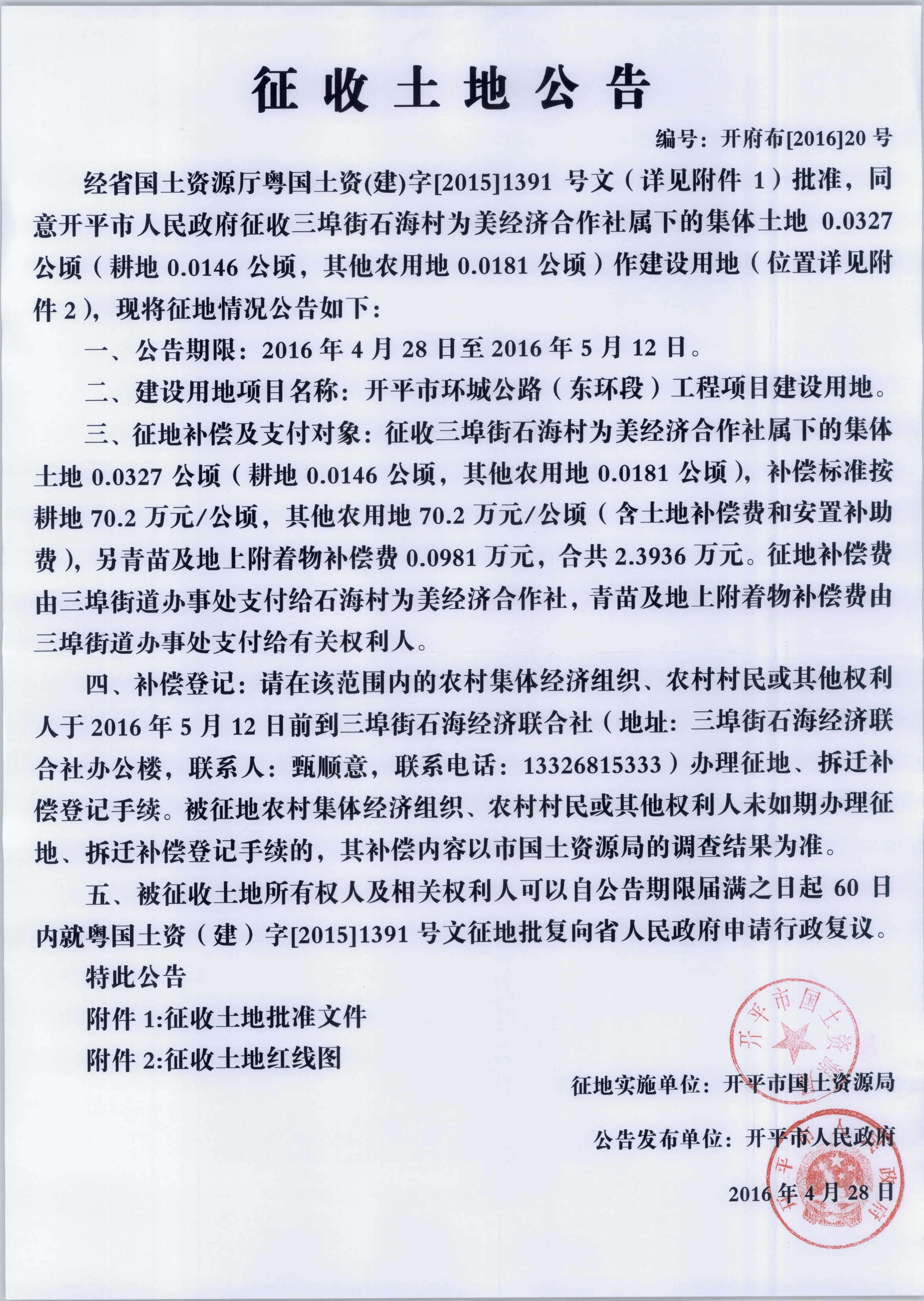 征收土地公告(開平市環(huán)城公路(東環(huán)段)工程項目建設(shè)用地)