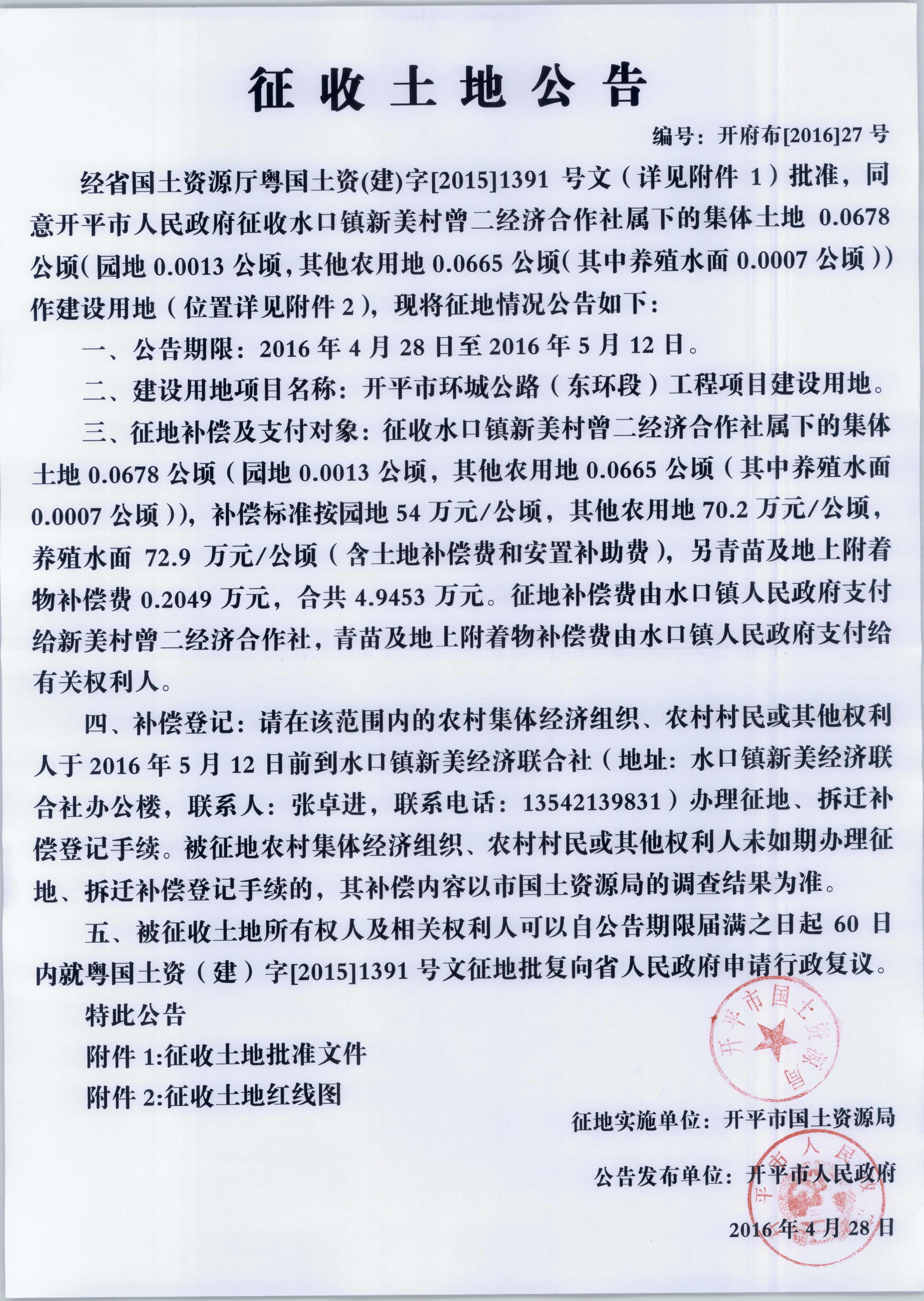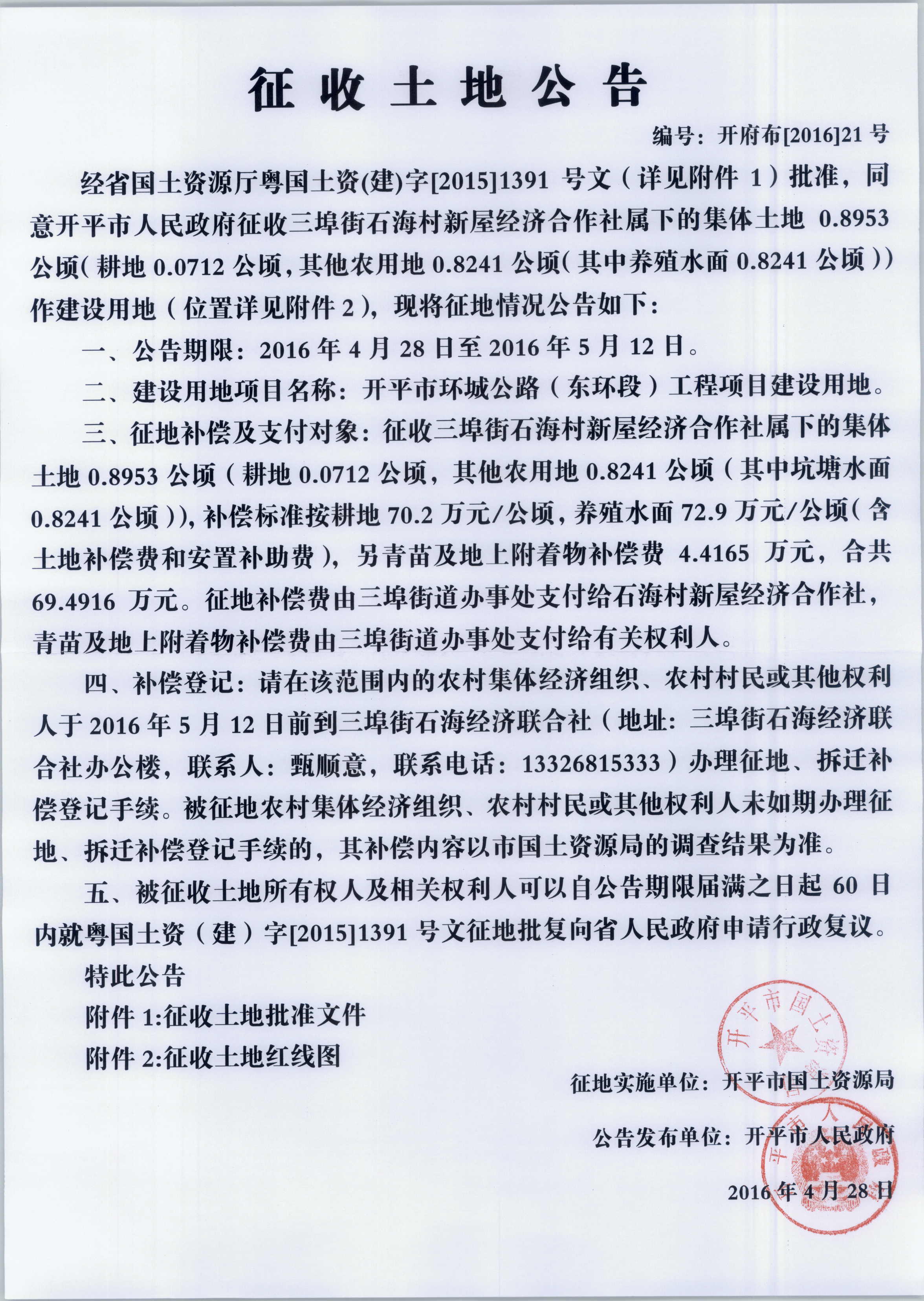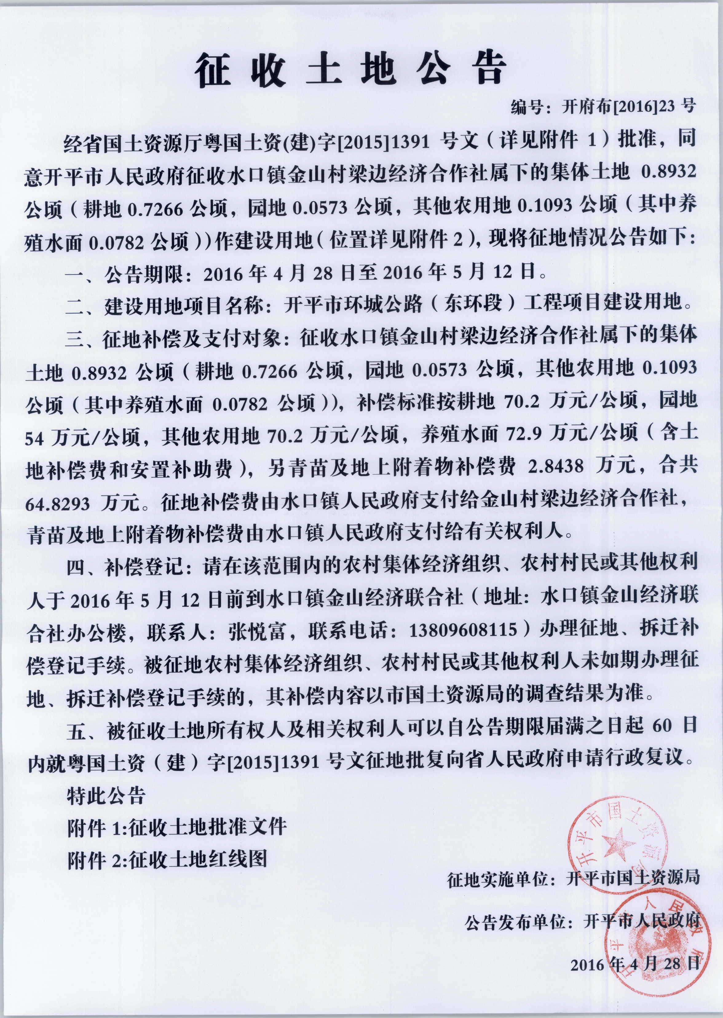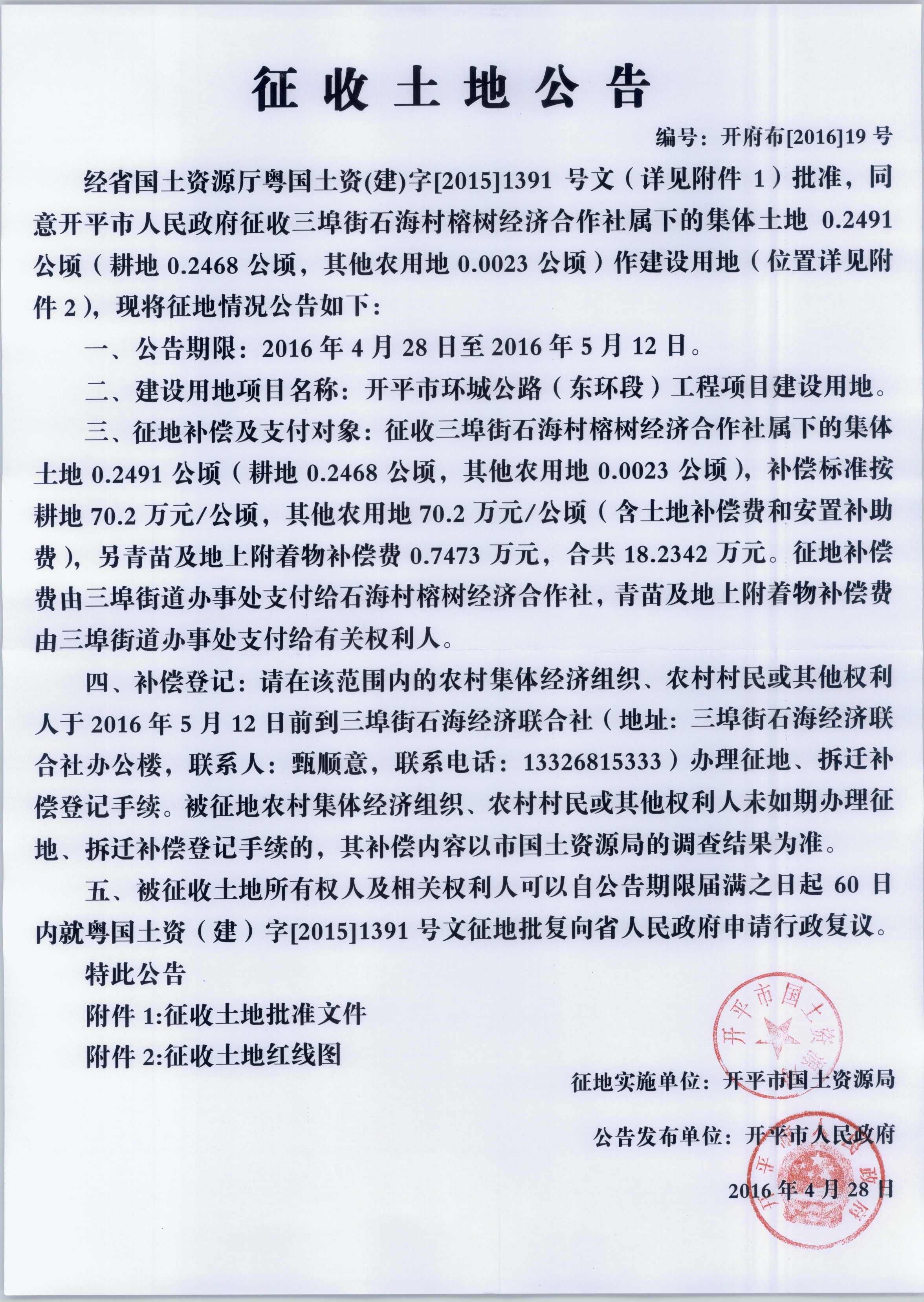 征收土地公告(開平市環(huán)城公路(東環(huán)段)工程項目建設(shè)用地)