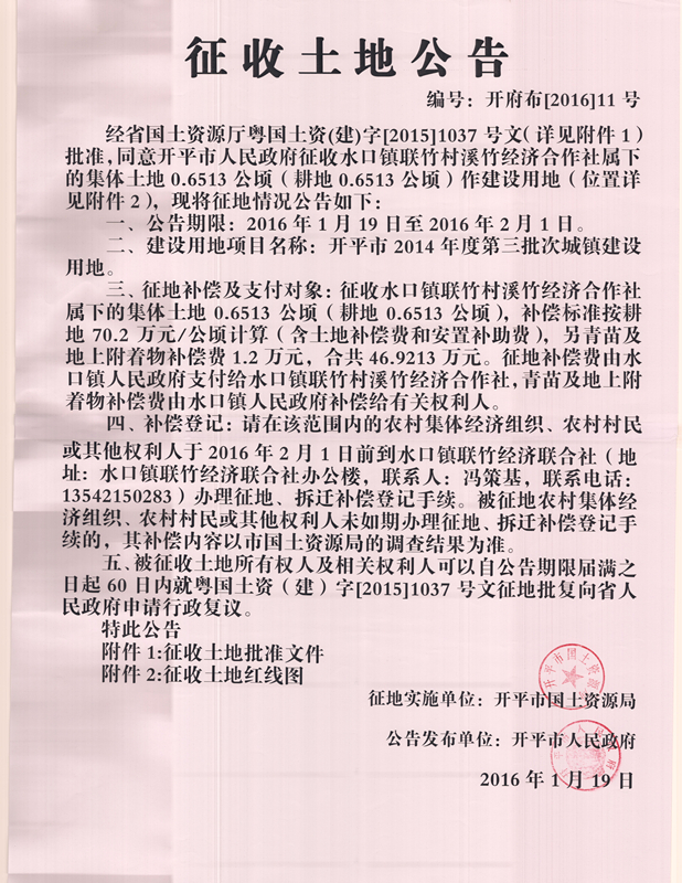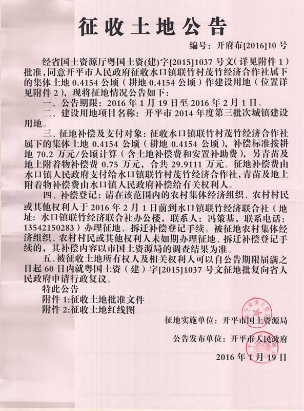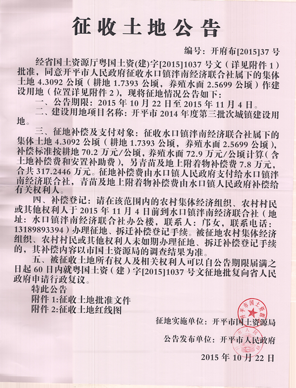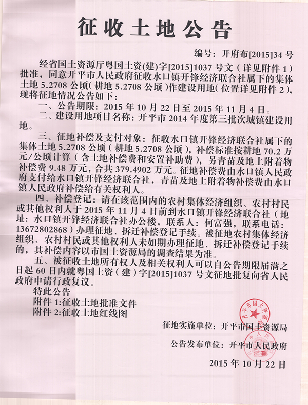 征收土地公告(開平市2014年度第三批次城鎮(zhèn)建設用地)
