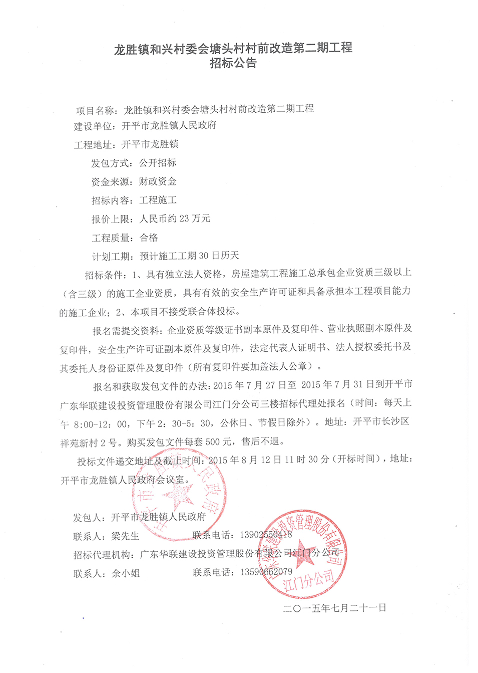 龍勝鎮(zhèn)和興村委會塘頭村村前改造第二期工程招標(biāo)公告