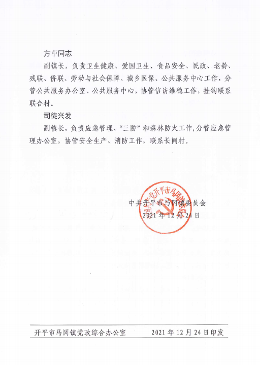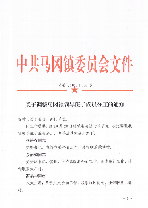 馬委【2021】131號(hào)關(guān)于調(diào)整馬岡鎮(zhèn)領(lǐng)導(dǎo)班子分工的通知