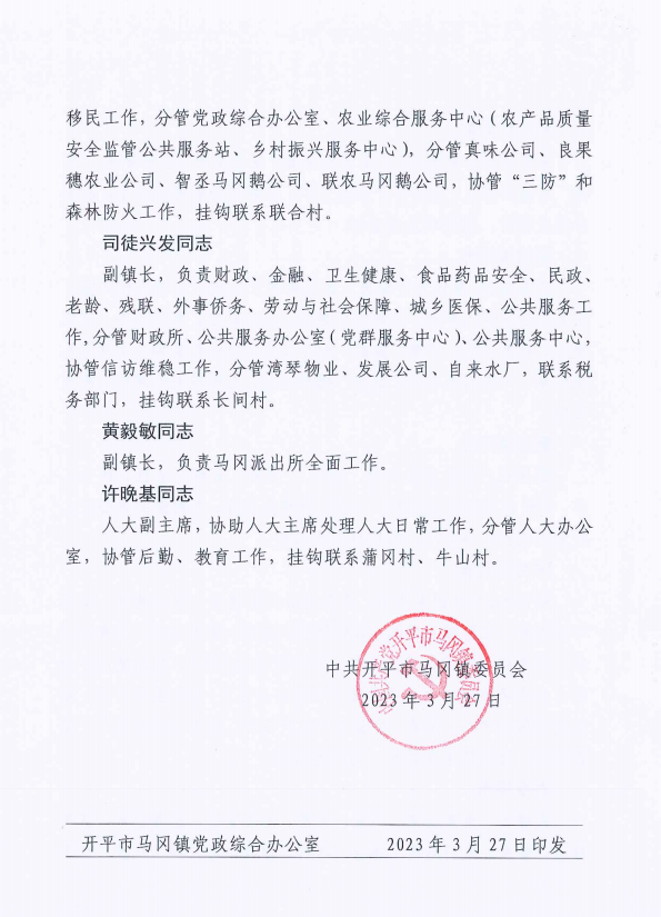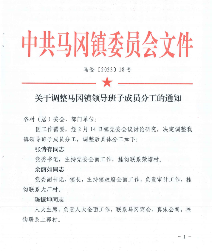 關(guān)于調(diào)整馬岡鎮(zhèn)領(lǐng)導(dǎo)班子成分工的通知