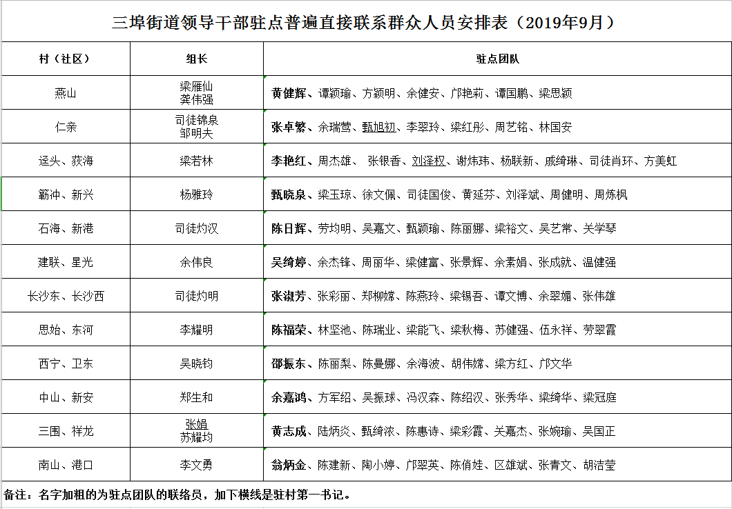 三埠街道領(lǐng)導(dǎo)干部駐點(diǎn)普遍直接聯(lián)系群眾人員安排表(2019年9月)