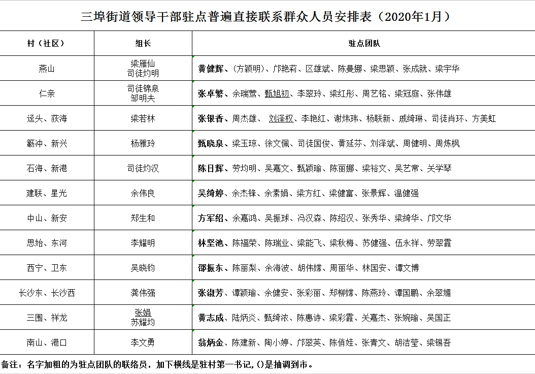 三埠街道領(lǐng)導(dǎo)干部駐點普遍直接聯(lián)系群眾人員安排表(2020年1月)